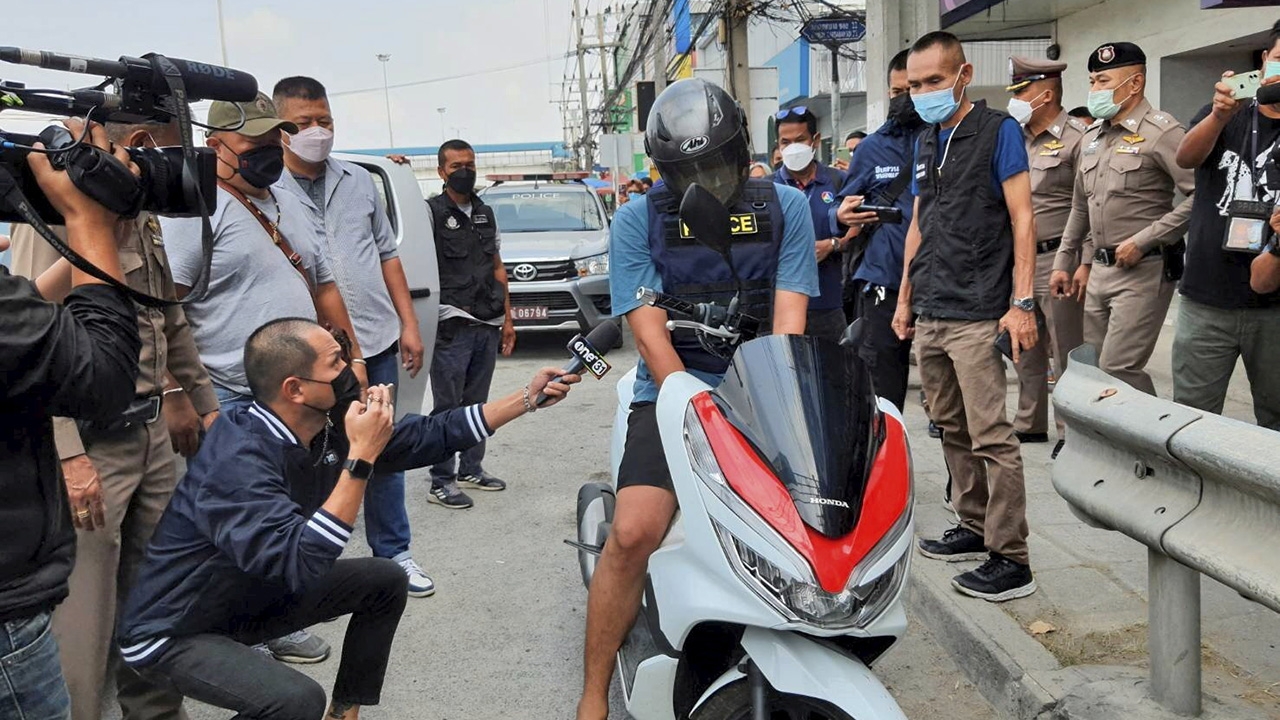 นายวีระชัย หรือเบิ้ม อรรถชาติ อายุ 33 ปี ผู้ต้องหาบุกเดี่ยวจี้ชิงทรัพย์ธนาคารไทยพาณิชย์ สาขาหินกอง อ.หนองแค จ.สระบุรี ถูกตำรวจคุมตัวไปทำแผนประกอบคำรับสารภาพตั้งแต่นำรถ จยย.ไปจอดก่อนบุกเข้าไปก่อเหตุ.