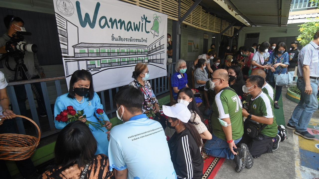 ศิษย์เก่า ร.ร.วรรณวิทย์ ร่วมแสดงมุทิตาจิตด้วยการคุกเข่ามอบดอกไม้ให้เหล่าครูอาวุโสของ ร.ร. ในงาน “สิ้นเสียงระฆัง วรรณวิทย์” ซึ่งจัดขึ้นเพื่ออำลาก่อนปิด ร.ร.ถาวร เพราะประสบภาวะขาดทุน ต่อเนื่อง จบตำนาน 76 ปี ของ ร.ร.เอกชนใจกลางกรุง ที่เก็บค่าเล่าเรียนถูกที่สุด.