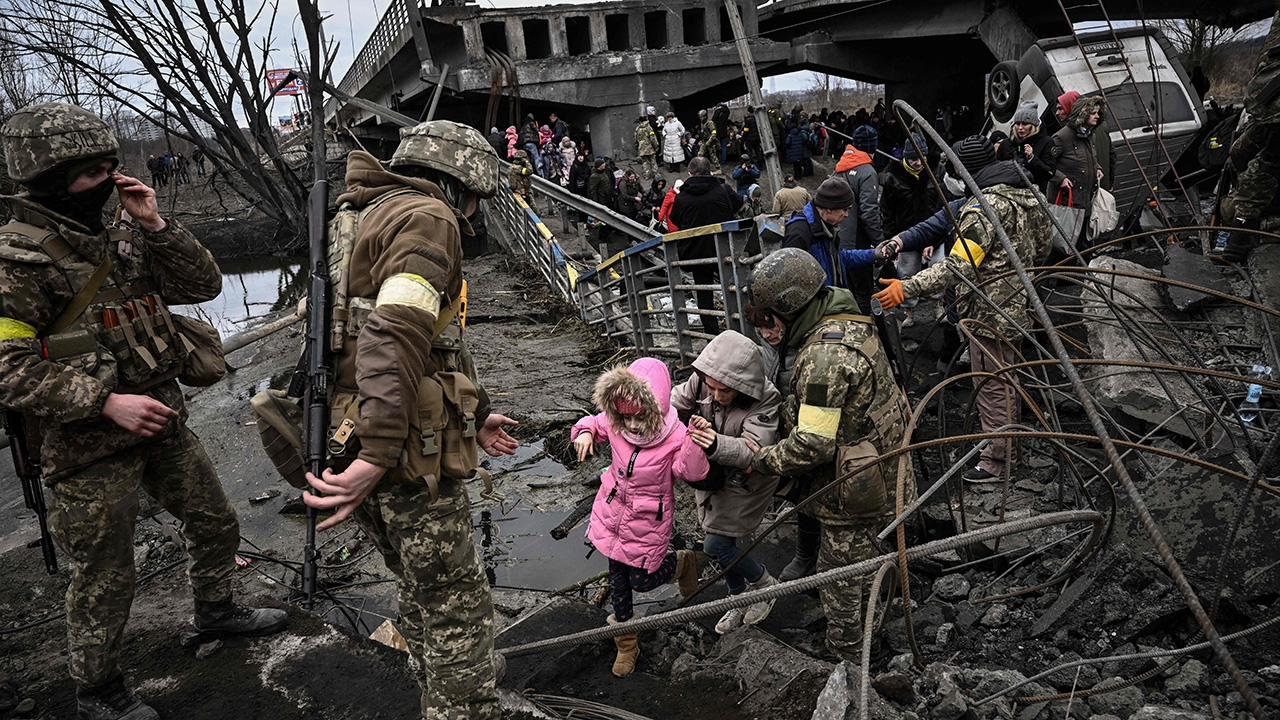 ทหารยูเครนเข้าช่วยเหลือชาวบ้านอพยพออกจากเมืองอีร์ปิน ชานกรุงเคียฟ ผ่านทางซากสะพานที่ถูกยิงถล่ม หลังกองทัพรัสเซียปฏิบัติการโจมตีทางอากาศอย่างต่อเนื่อง จนไม่สามารถใช้เส้นทางคมนาคมตามปกติได้.
