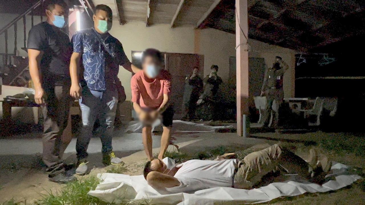 ตำรวจคุมตัวนายสุรชัย โมรา มีอาการป่วยทางจิต ทำแผนประทุษกรรมใช้มีดปังตอสับหัวนายบุญลือ โมรา พ่อบังเกิดเกล้าตายสยองคาบ้านใน อ.สรรคบุรี จ.ชัยนาท โมโหพ่อบ่นว่าเรื่องดื่มน้ำ อัดลมขณะกินข้าวเย็น.