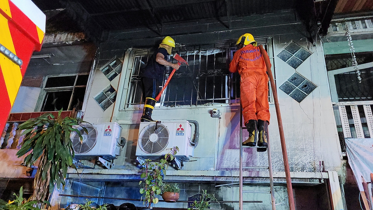 เจ้าหน้าที่ขึ้นไปฉีดน้ำดับไฟที่ทาวน์เฮาส์ 2 ชั้น หมู่บ้านนครทอง ต.เทพรักษ์ อ.เมืองสมุทรปราการ ติดเหล็กดัดแบบปิดตาย ไฟโหมลุกไหม้ที่ ชั้น 2 เป็นเหตุให้มีผู้เสียชีวิตถูกไฟคลอกอยู่ที่ห้องนอนรวม 3 ศพ ร่างดำเป็นตอตะโก คาดสาเหตุคอมเพรสเซอร์แอร์ระเบิดทำให้เกิดประกายไฟลุกไหม้.
