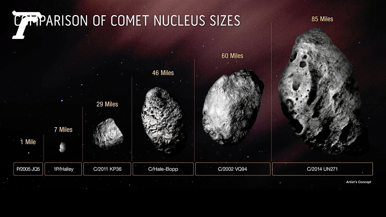 ดาวหางแตกต่างจากดาวเคราะห์น้อยตรงที่ดาวเคราะห์น้อยเป็นวัตถุที่เป็นหิน ในขณะที่ดาวหางนั้นประกอบด้วยหิน น้ำแข็ง และก๊าซที่แข็งตัว เมื่อเข้าใกล้ดวงอาทิตย์มันจะได้รับความร้อนจนทำให้น้ำแข็งกลายเป็นไอสะท้อนแสงอาทิตย์ จนมองเห็นเป็นเหมือนนิวเคลียสหรือหัวเรืองแสงและมีหางยาวเมื่อปี 2557 นักดาราศาสตร์นาม เปโดร เบอร์นาร์ดิเนลลี (Pedro Bernardinelli) และแกรี เบิร์นสไตน์ (Gary Bernstein) จากมหาวิทยาลัยเพนซิลเวเนีย ในสหรัฐอเมริกา ได้ค้นพบข้อมูลของดาวหางดวงหนึ่งจากกล้อง Dark Energy Camera (DE-Cam) ความละเอียด 570 ล้านพิกเซลของกล้องโทรทรรศน์วิกเตอร์ เอ็ม.บลังโก ที่หอดูดาวอินเตอร์-อเมริกัน เซอร์โร โทโลโล (CTIO) ในชิลี ซึ่งจริงๆแล้วดาวหางดวงนี้ถูกพบครั้งแรกจากโครงการสำรวจพลังงานมืด (Dark Energy Survey-DES) ในปี พ.ศ.2557 นั่นเอง ดาวหางถูกตั้งชื่อว่า C/2014 UN271 หรือรู้จักในอีกชื่อคือ ดาวหางเบอร์นาร์ดิเนลลี-เบิร์นสไตน์ (Bernardinelli-Bernstein) ถูกระบุว่ามีขนาดใหญ่ที่สุดเท่าที่เคยค้นพบ ซึ่งมันเดินทางมาจากขอบระบบสุริยะและมุ่งหน้าไปยังทิศทางของดวงอาทิตย์อย่างรวดเร็วล่าสุด นักดาราศาสตร์ได้กำหนดขนาดของดาวหาง C/2014 UN271 ได้แล้วว่ามันมีความกว้างเกือบ 129 กิโลเมตร ใหญ่กว่าเกาะโรดไอร์แลนด์ ในสหรัฐฯ หนักประมาณ 500,000 ล้านล้านกิโลกรัม ซึ่งมากกว่าดาวหางส่วนใหญ่ประมาณ 100,000 เท่า นอกจากนี้ C/2014 UN271 ยังเดินทางด้วยความเร็ว 35,405 กิโลเมตรต่อชั่วโมง โดยกำลังเข้าใกล้โลกมากขึ้น แต่ไม่มีอะไรที่ต้องกังวล เพราะดาวหางดวงนี้จะเฉียดใกล้โลกที่สุดในปี 2574.(Credit : NASA, ESA, Zena Levy (STScI))