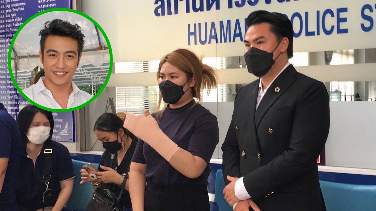 น.ส.ปรารถนา โรจนณะแก้วประเสริฐ โชว์แขนที่บาดเจ็บหลังถูกนายชานนท์ หรือขุน อักขระชาตะ (ภาพเล็ก) นักแสดงหนุ่ม ขับรถเฉี่ยวชนขณะขี่รถ จยย. โดยนักแสดงหนุ่มยอมจ่ายค่าเสียหาย แต่ตำรวจยังต้องดำเนินคดีต่อ.
