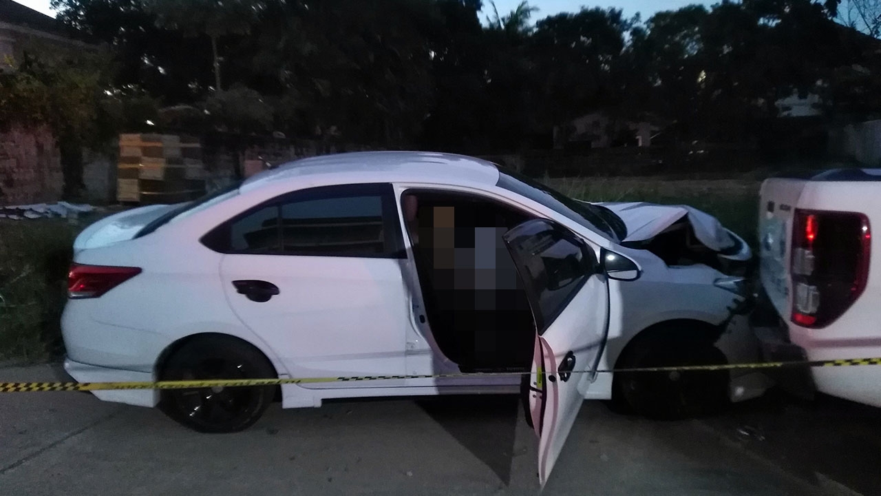 สภาพศพ น.ส.ลมินันท์ แก้วสว่าง นายชุติพงศ์ โชคชัย ที่เสียชีวิตในรถเก๋งวีออส สีขาว หลังฝ่ายชายตามง้อ ฝ่ายหญิงไม่สำเร็จ เพราะเจ้าตัวติดพนันออนไลน์ ก่อนใช้ปืนยุติปัญหา เหตุเกิดในพื้นที่ สน.แสมดำ.