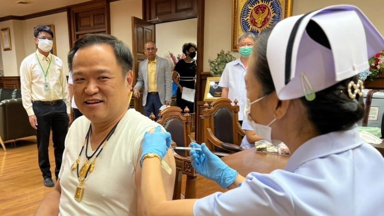 ภาพนายอนุทิน ชาญวีรกูล รองนายกฯ และ รมว.สาธารณสุข วันที่เข้าฉีดวัคซีนเข็มที่ 6 (13 มิ.ย.) แต่ล่าสุดติดโควิด-19 เช่นเดียวกับนายจุรินทร์ ลักษณวิศิษฏ์ รองนายกฯ และ รมว.พาณิชย์ หลังกลับจากยุโรปทั้งคู่.
