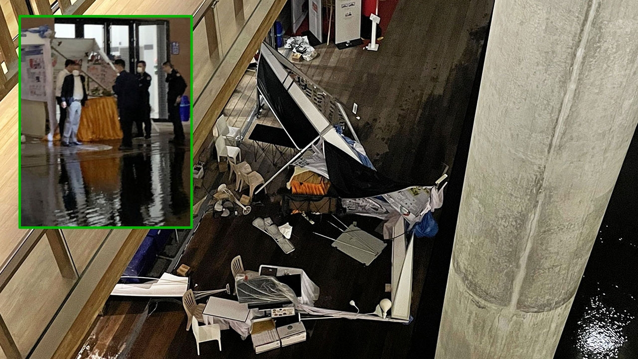 สภาพพื้นที่จัดนิทรรศการ 90 ปีรัฐสภา บริเวณพื้นไม้ ชั้น 1 อาคารรัฐสภาใหม่ แยกเกียกกาย มูลค่า 12,280 ล้านบาท เปียกปอนล้มระเกะระกะ จนเจ้าหน้าที่ต้องเร่งเก็บ วัสดุอุปกรณ์ที่พังเสียหายน้ำท่วมนองเต็มพื้น (รูปเล็ก) หลังมีฝนตกหนักช่วงค่ำวันที่ 1 ก.ค. ทั่วทั้ง พื้นที่กรุงเทพฯ สะท้อนความบกพร่อง เมื่อฝนตก น้ำจะหยดรั่วซึมทุกครั้ง.
