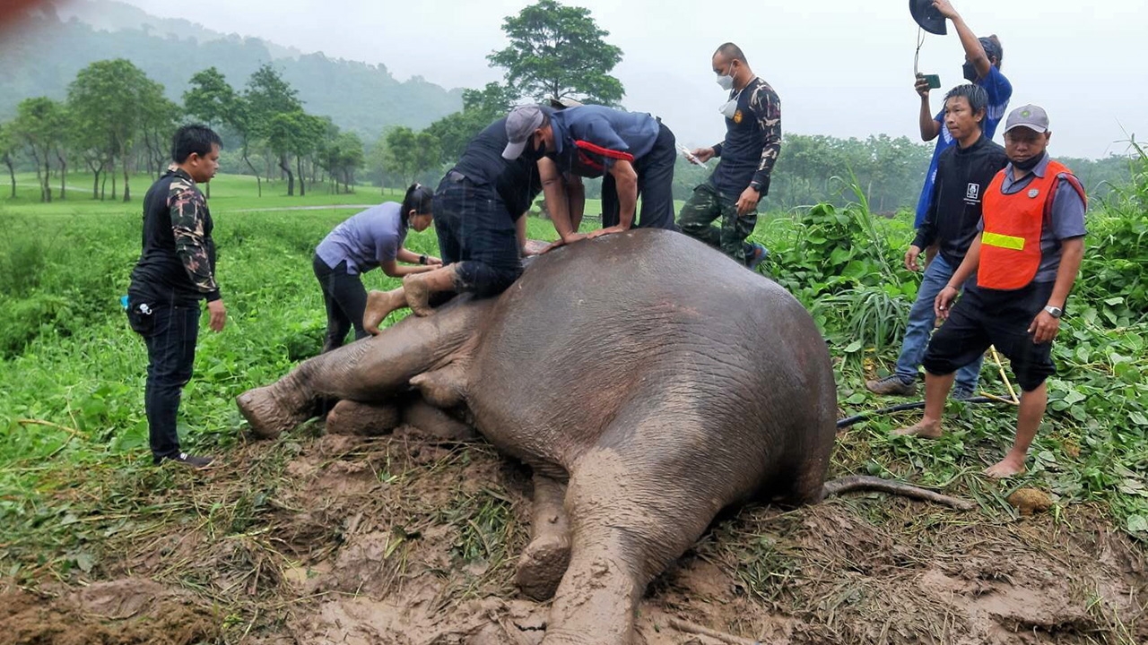 ทีมสัตวแพทย์และเจ้าหน้าที่อุทยานแห่งชาติเขาใหญ่ช่วยกันกดลำตัวกระตุ้นแม่ช้างให้เลือดหมุนเวียน หลังลูกช้างตกท่อระบายน้ำ หลังสนามกอล์ฟรอยัลฮิลล์ จ.นครนายก แม่ช้างหวงลูกไม่ให้เข้าใกล้ ทีมสัตวแพทย์ต้องยิงยาซึมใส่แม่ช้างแต่เกิดช็อกช่วยกันปั๊มจนปลอดภัย ส่วนลูกช้างช่วยขึ้นมาจากท่อสำเร็จ จากนั้นสองแม่ลูกช้างเดินกลับคืนสู่ป่า.