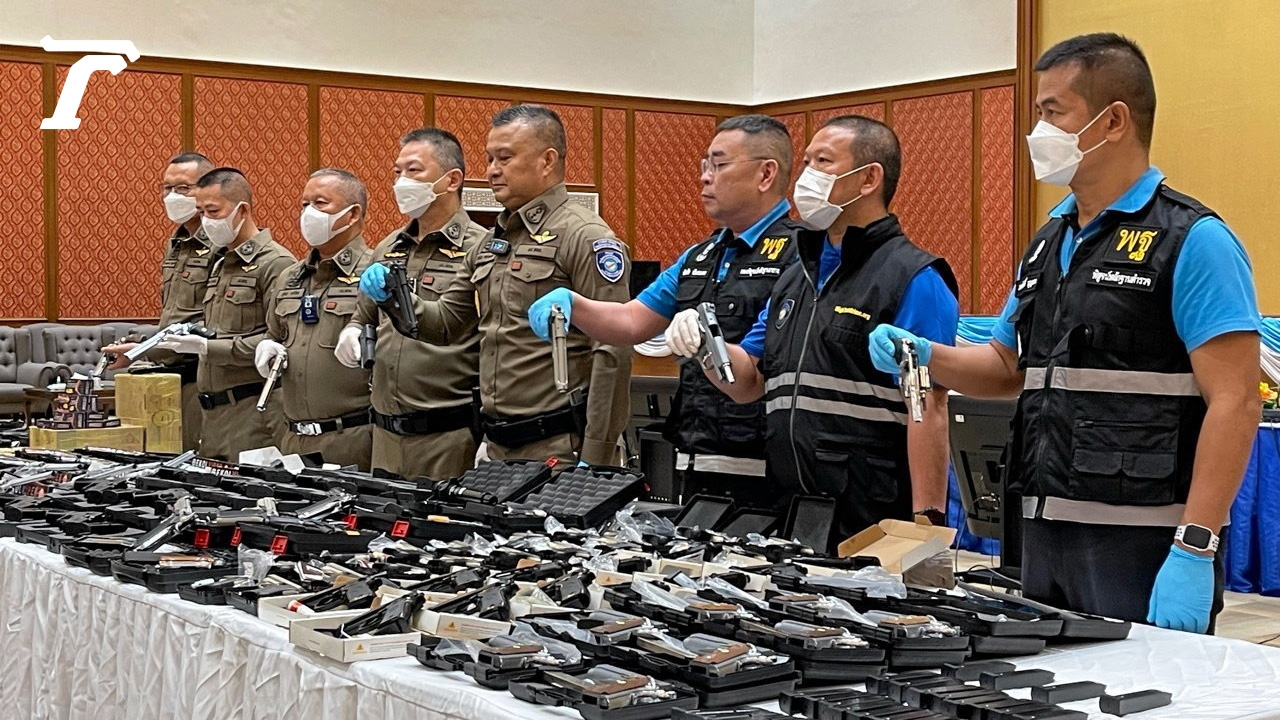 ตำรวจไซเบอร์บุกทลายแหล่งค้าปืนแบลงก์กัน-ปืนอัดลมผ่านทางออนไลน์ จู่โจมค้นสถานที่จำหน่ายและจัดเก็บ 2 จุดกลางกรุง ยึดของกลางรวม 2,245 กระบอก พร้อมกระสุนกว่า 8 พันนัด จับกุมผู้ต้องหา 1 คน อ้างมีใบอนุญาตจากกรมการปกครอง แต่แท้จริงเป็นใบอนุญาตขายสิ่งเทียมอาวุธปืนเท่านั้น ยืนยัน “แบลงก์กัน” เป็นอาวุธปืน ไม่ใช่สิ่งเทียมอาวุธปืน เร่งประสานกระทรวงมหาดไทยแก้ปัญหาที่ต้นเหตุเรื่องการนำเข้าจากต่างประเทศ ชี้อันตรายซื้อขายกันง่ายจนเป็นต้นตอคดีอาชญากรรมรุนแรงที่กองบัญชาการตำรวจสืบสวนสอบสวนอาชญากรรมทางเทคโนโลยี หรือ บช.สอท. เมืองทองธานี เมื่อเวลา 10.30 น.วันที่ 14 ก.ค. พล.ต.ท.กรไชย คล้ายคลึง ผบช.สอท. พร้อมพวกร่วมแถลงผลการตรวจค้นแหล่งจำหน่ายอาวุธปืนทางออนไลน์ 2 จุดในพื้นที่กรุงเทพฯ จับกุมนายสิทธิพจน์ หรือต้น วันเพ็ญ อายุ 50 ปี ในฐานความผิดจำหน่ายอาวุธปืนและเครื่องกระสุนปืนโดยไม่ได้รับอนุญาต และช่วยซ่อนเร้น จำหน่าย พาเอาไป หรือรับไว้ ซึ่งของอันตนพึงรู้ว่านำเข้ามาโดยไม่ถูกต้องตามพิธีการทางศุลกากร ของกลางปืนแบลงก์กัน 2,103 กระบอก ปืนอัดลมแรงดันสูง 142 กระบอก กระสุนแบลงก์กัน 82,450 นัด กระสุนปืนอัดลมแรงดันสูง 410 กล่อง และอุปกรณ์ส่วนควบ 128 ชิ้นพล.ต.ท.กรไชยเผยว่า สืบเนื่องจากข่าวคนร้ายใช้ปืนยิงตำรวจที่เข้าระงับเหตุวัยรุ่นทะเลาะวิวาทกันจนเสียชีวิตในพื้นที่ อ.คลองหลวง จ.ปทุมธานี และเหตุอื่นๆลักษณะเดียวกัน ประกอบกับการก่อเหตุลอบสังหารบุคคลสำคัญในต่างประเทศ พบว่าปืนส่วนใหญ่ที่นำมาใช้ก่อเหตุเป็นปืนที่ผู้กระทำผิดดัดแปลงทำขึ้น ซื้อขายผ่านทางออนไลน์ ตำรวจไซเบอร์สืบสวนพบว่ามีการลักลอบจำหน่ายปืนผิดกฎหมายผ่านแพลตฟอร์มออนไลน์ กระทั่งวันที่ 12 ก.ค. ได้รวบรวมพยานหลักฐานนำหมายศาลมีนบุรีเข้าตรวจค้นสถานที่น่าเชื่อว่าเป็นแหล่งจำหน่ายและเก็บอาวุธปืน 2 จุดจุดแรกร้านแห่งหนึ่งถนนราษฎร์พัฒนา แขวงและเขตสะพานสูง กรุงเทพฯ ยึดปืนแบลงก์กัน 1,865 กระบอก กระสุนแบลงก์กัน 82,450 นัด และอุปกรณ์ส่วนควบ 31 ชิ้น เจ้าของโต้แย้งว่าครอบครองอย่างถูกต้องตามกฎหมาย ส่งให้เจ้าหน้าที่ พฐ.ตรวจสอบของกลางทั้งหมดอย่างละเอียด ส่วนจุดที่ 2 ตรวจค้นบ้านเลขที่ 1899/110 หมู่บ้านเพอร์เฟคเพลส วงแหวนรามคำแหง ถนนเคหะร่มเกล้า แขวงคลองสองต้นนุ่น เขตลาดกระบัง กรุงเทพฯ ตรวจยึดปืนอัดลมแรงดันสูง 142 กระบอก ปืนแบลงก์กัน 238 กระบอก กระสุนปืนอัดลมแรงดันสูง 410 กล่อง และอุปกรณ์ส่วนควบ 97 ชิ้น พร้อมจับกุมนายสิทธิพจน์ วันเพ็ญ อายุ 50 ปี เจ้าของบ้าน นำตัวส่งพนักงานสอบสวนดำเนินคดี โดยร้านดังกล่าวเปิด