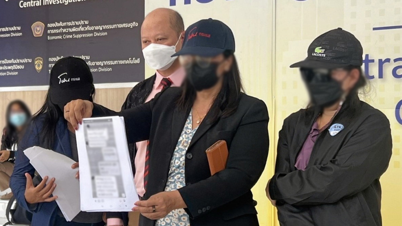 นายรัชพล ศิริสาคร ทนายความ พา 3 หญิงสาวผู้เสียหายมาลงบันทึกประจำวันที่ศูนย์รับแจ้งความ บช.ก. เพื่อแสดงความบริสุทธิ์ใจว่าไม่มีเจตนาเป็นภรรยาน้อย หลังถูกชายวัย 61 ปีหลอกคบหา เกรงเมียหลวงจะฟ้องเอาผิด.