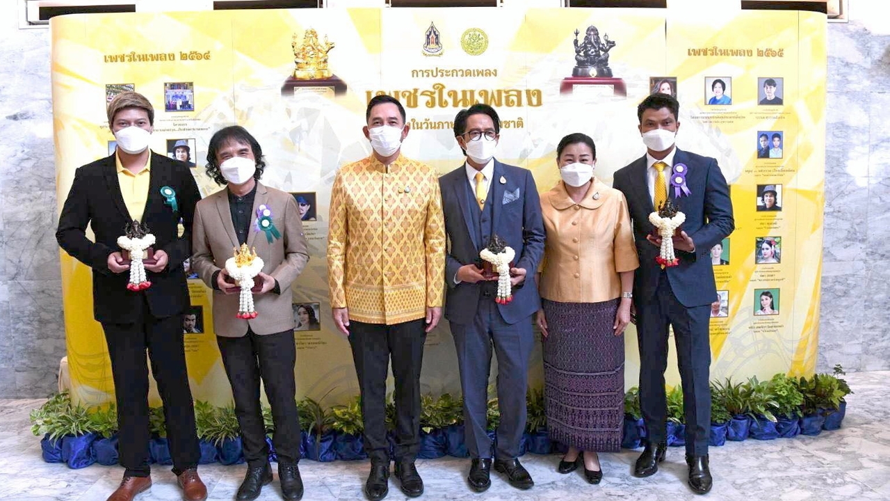 นายอิทธิพล คุณปลื้ม รมว.วัฒนธรรม มอบรางวัลเพชรในเพลงปี 2564-2565 แก่ศิลปินนักร้อง มีเบิร์ด-ธงไชย แมคอินไตย์ ครูสลา คุณวุฒิ หนุ่ม กะลา หรือณพสิน แสงสุวรรณ และนัน ไมค์ทองคำ หรืออนันต์ อาศัยไพรพนา.