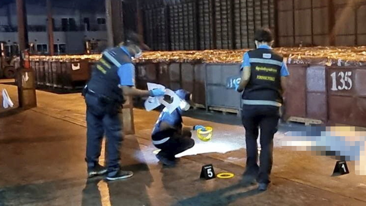 ตำรวจเก็บหลักฐานในโรงงานยางแท่ง สหกรณ์กองทุนสวนยางบ้านเขาซก อ.หนองใหญ่ จ.ชลบุรี หลังนายสมชาติ มานะ ช่างซ่อมบำรุง บุกใช้ปืน 9 มม. รัวยิงนายพิทักษ์ ทวีทรัพย์ ผู้ช่วยหัวหน้าฝ่ายผลิตตายคาโรงงาน อ้างชำระแค้นเหยื่อแอบตีท้ายครัว ห้ามแล้วไม่ฟัง ขณะที่ภรรยามือยิง โต้ไม่ได้มีสัมพันธ์ฉาวกับผู้ตาย.