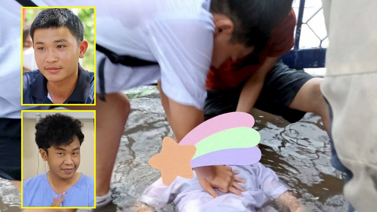 ภาพเหตุการณ์ขณะนายปรัชญา หรือบอส ใจบุญ (บน) ปั๊มหัวใจช่วยชีวิตนักเรียนหญิงถูกไฟรั่วช็อตหมดสติที่เสาไฟประตูหลังโรงเรียนสตรีราชินูทิศ จ.อุดรธานี ส่วนนายอรรถชัย หรือบาส อาจอุดม (ล่าง) ที่ช่วยชีวิตเด็กชายอีกคนถูกไฟช็อตหมดสตินอนแช่น้ำจุดเดียวกันจนตัวเองบาดเจ็บไปด้วย สังคมแห่ชื่นชมความกล้าหาญของ 2 หนุ่มฮีโร่.