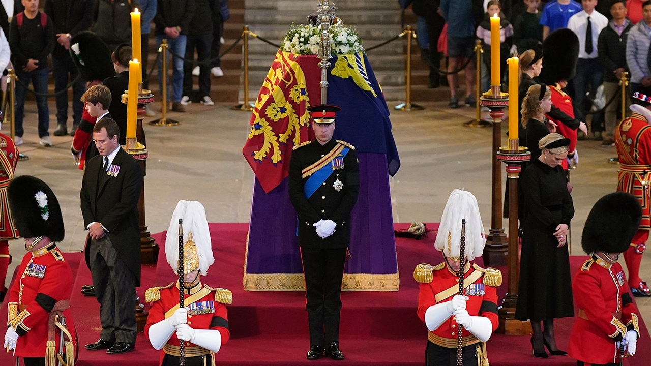 เจ้าชายวิลเลียม เจ้าชายแห่งเวลส์ ทรงฉลองพระองค์ในชุดเครื่องแบบทหาร ทรงนำพระราชนัดดาของ สมเด็จพระราชินีนาถ เอลิซาเบธที่ 2 รวม 8 พระองค์ ทรงประกอบพิธีอารักขาหีบพระบรมศพ ตามโบราณราชประเพณีและยืนสงบนิ่งไว้อาลัยเป็นเวลานาน 15 นาที เป็นครั้งสุดท้าย ณ เวสต์มินสเตอร์ ฮอลล์ พระราชวังเวสต์มินสเตอร์.
