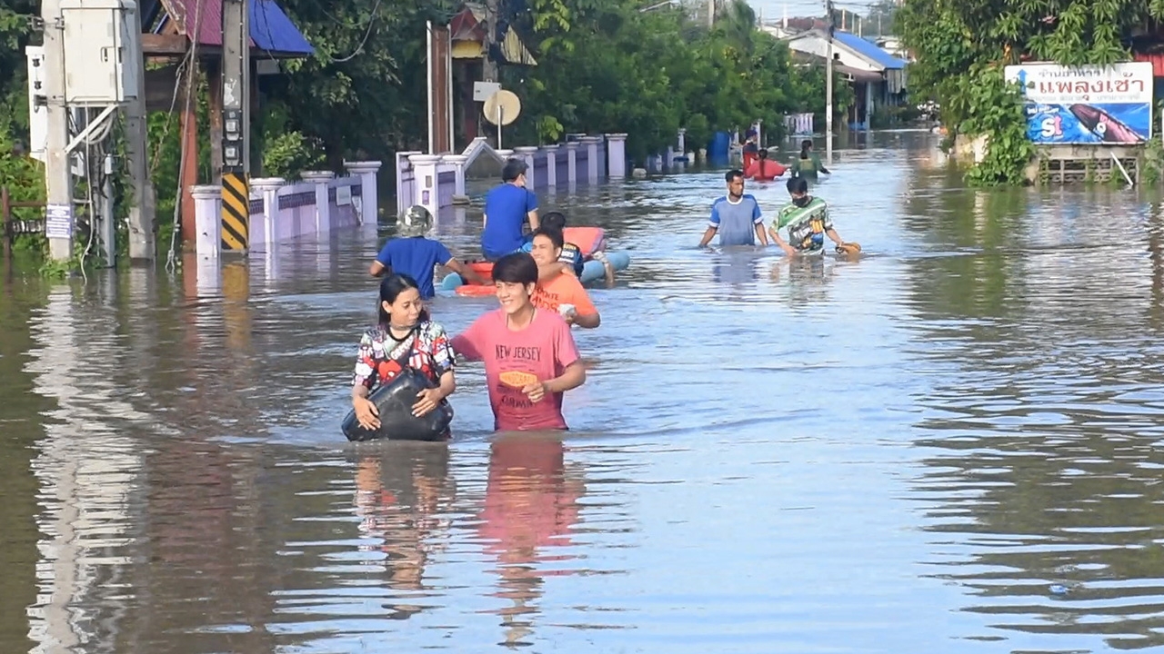 ชาวบ้านเดินลุยน้ำ ท่วมสูงถึงเอวอย่างทุลักทุเล หลังเกิด เหตุแนวกระสอบทรายคันกั้นน้ำริมแม่น้ำเจ้าพระยาแตกเป็นแนวยาวกว่า 20 เมตร ที่หมู่ 3 ต.บ้านหม้อ อ.พรหมบุรี จ.สิงห์บุรี ทำให้มวลน้ำมหาศาลไหลทะลักเข้าท่วมพื้นที่ 4 หมู่บ้าน รวม 705 หลังคาเรือนอย่างรวดเร็ว ต้องขนย้ายข้าวของและรถไป ไว้ที่ถนนสายคันคลองหน้าวัดตราชู.