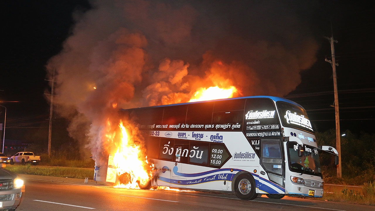 เปลวเพลิงลุกไหม้อย่างรุนแรงบริเวณท้ายรถทัวร์สายภูเก็ต-อุบลฯ บนถนนพระราม 2 ขาล่องใต้ กม.ที่ 78-79 อ.อัมพวา จ.สมุทรสงคราม โชคดีคนขับกับผู้โดยสารหนีลงมาได้ก่อน สาเหตุจากยางหลังระเบิดเกิดประกายไฟ.