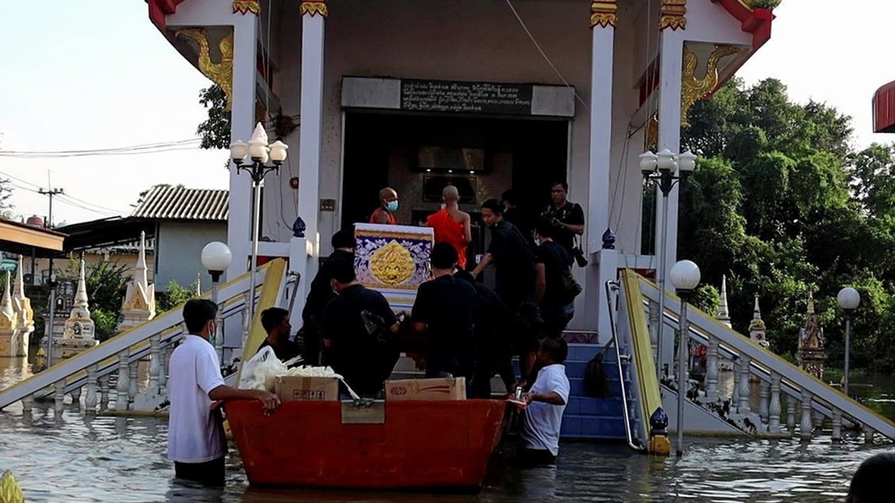 ญาติช่วยกันยกโลงศพนายสำเนา สุขเลิศกิข อายุ 81 ปี ออกจากเรือท้องแบนขึ้นเมรุไปประกอบพิธีเผาศพ ที่วัดพิกุลโสคันธ์ อ.บางบาล จ.พระนครศรีอยุธยา กันอย่างทุลักทุเล หลังน้ำท่วมขังมากว่า 3 เดือน ชาวบ้านใช้ชีวิตอย่างลำบาก.