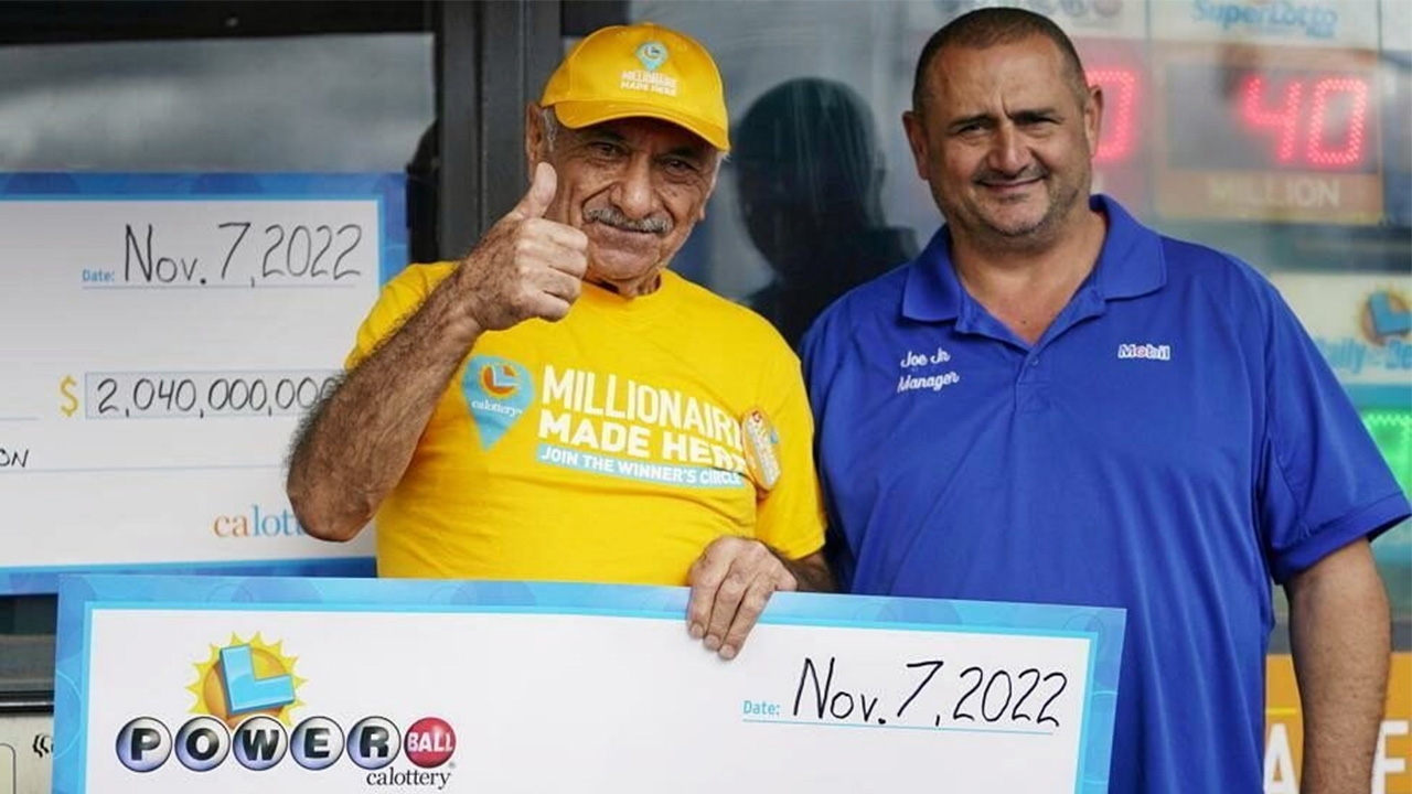 นายโจเซฟ ชาฮาเอด (เสื้อเหลือง) เจ้าของร้านขายลอตเตอรี่พาวเวอร์บอลในรัฐแคลิฟอร์เนียรับเงินตอบแทน 1 ล้านดอลลาร์สหรัฐฯ ประมาณ 37 ล้านบาท หลังมีผู้โชคดีซื้อลอตเตอรี่ที่ร้านแล้วแจ็กพอตแตกได้รางวัลกว่า 2 พันล้านดอลลาร์ฯ ประมาณ 7.5 หมื่นล้านบาท แต่ยังไม่ปรากฏตัว.