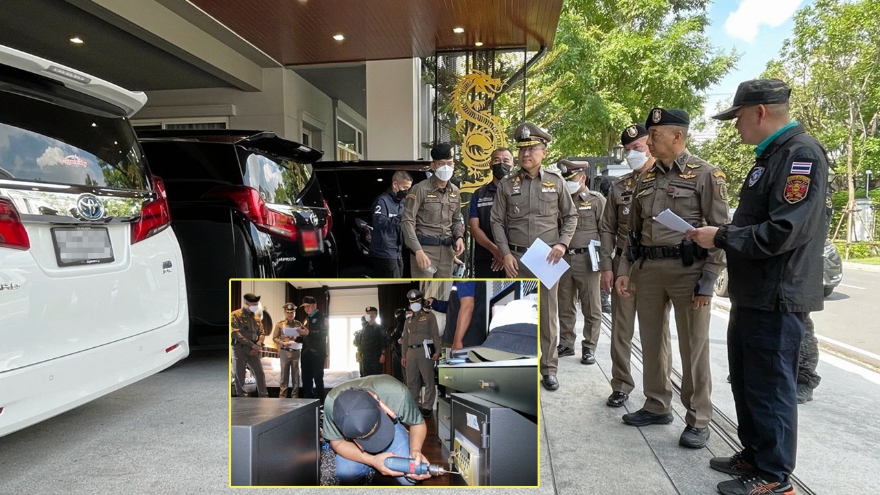 ตำรวจหลายหน่วยสนธิ กำลังตรวจค้นบ้านหรูเครือข่ายธุรกิจจีนสีเทากว่า 10 หลังในหมู่บ้านย่านลาซาล แต่ละหลังราคา 50 ล้านบาท รวมทั้งคอนโดระฟ้าย่านเจริญนคร ตรวจสอบเซฟ ยึดเงินสด (รูปเล็ก) เครื่องประดับและรถหรู.