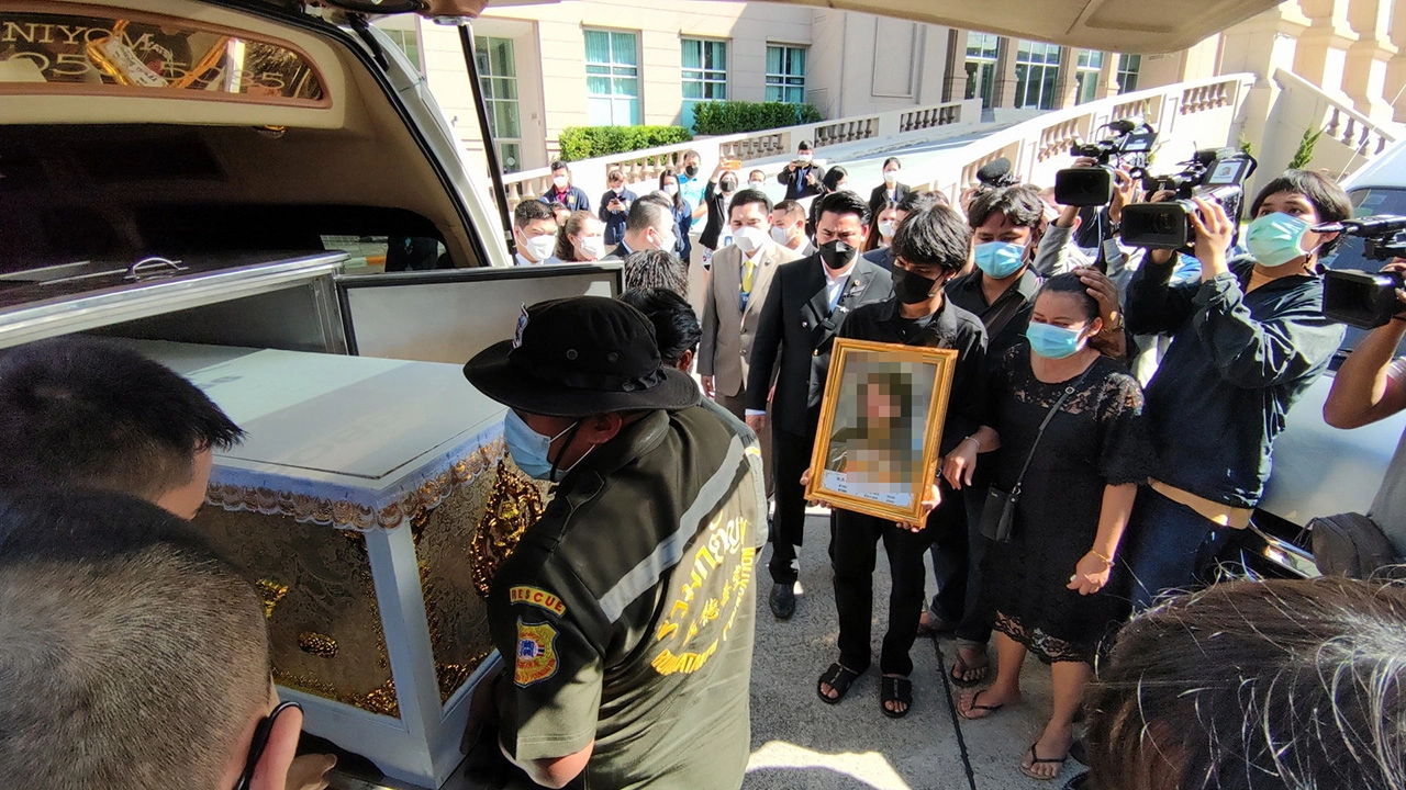น.ส.สายม้าน แฉกกระโทก พร้อมครอบครัวช่วยกันแห่โลงศพ น.ส.อารยา ชูขวัญ ลูกสาวและทารกเพศชายอายุในครรภ์ 8 เดือนเข้าร้องทุกข์ที่ ยธ. คาใจสาเหตุการตายที่อาจเกิดจากการรักษาของหมอคลินิกใน จ.สระแก้ว.
