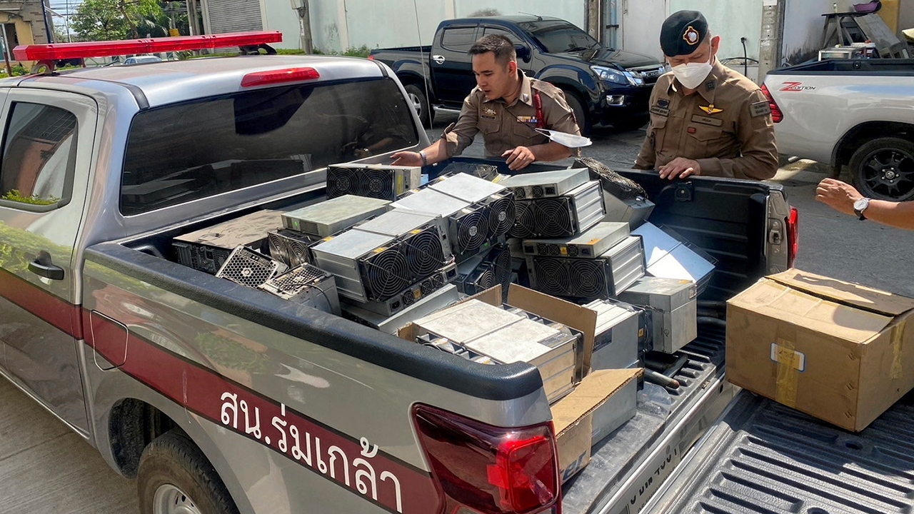 ตำรวจ สน.ร่มเกล้าอายัดอุปกรณ์ขุดบิทคอยน์หลายรายการ ในอาคารพาณิชย์ย่านลาดกระบัง กทม. หลังเจ้าหน้าที่การไฟฟ้าตรวจพบแก๊งขุดบิทคอยน์ขโมยไฟฟ้าใช้ทุ่นรายจ่ายมานาน 3 ปี มูลค่าความเสียหาย 10 ล้านบาท.