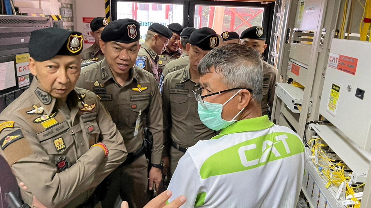 พล.ต.อ.ต่อศักดิ์ สุขวิมล รอง ผบ.ตร. นำกำลังตำรวจตรวจสอบการพาดสายสื่อสารไปฝั่งกัมพูชาที่บริษัทโทรคมนาคมแห่งชาติ อ.อรัญประเทศ จ.สระแก้ว เพื่อตัดสัญญาณหลังพบแก๊งคอลเซ็นเตอร์ใช้หลอกเหยื่อคนไทย.
