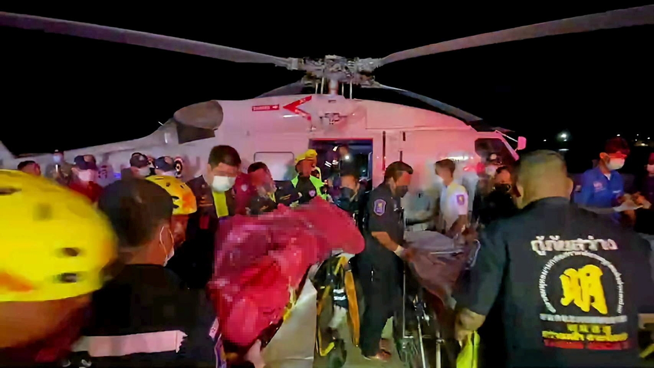 จนท.กู้ภัยลำเลียงร่างลูกเรือ ร.ล.สุโขทัย ที่ประสบเหตุอับปางกลางทะเลอ่าวไทย จำนวน 5 นาย ลงจากเฮลิคอปเตอร์กองทัพเรือ ก่อนส่งไปชันสูตรที่ศูนย์พิสูจน์อัตลักษณ์บุคคล บริเวณมูลนิธิสว่างราษฎร์ศรัทธาธรรมสถาน เขตเทศบาลกำเนิดนพคุณ อ.บางสะพาน จ.ประจวบคีรีขันธ์.