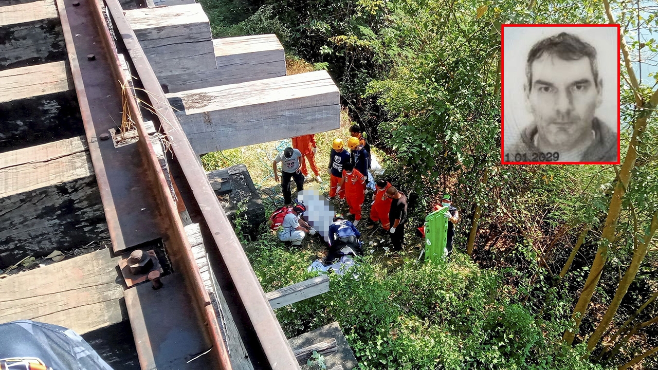 เจ้าหน้าที่เตรียมเคลื่อนย้ายศพนายแพตทริค เวิร์ด ชาวนิวซีแลนด์ (รูปเล็ก) ตกรถไฟสายมรณะช่วงโค้งถ้ำกระแซ จ.กาญจนบุรี ร่วงหน้าผาร่างกระแทกพื้น หลังยื่นตัวออกไปด้านนอกรถเพื่อถ่ายรูป แล้วพลาดพลัดตกดับอนาถ.