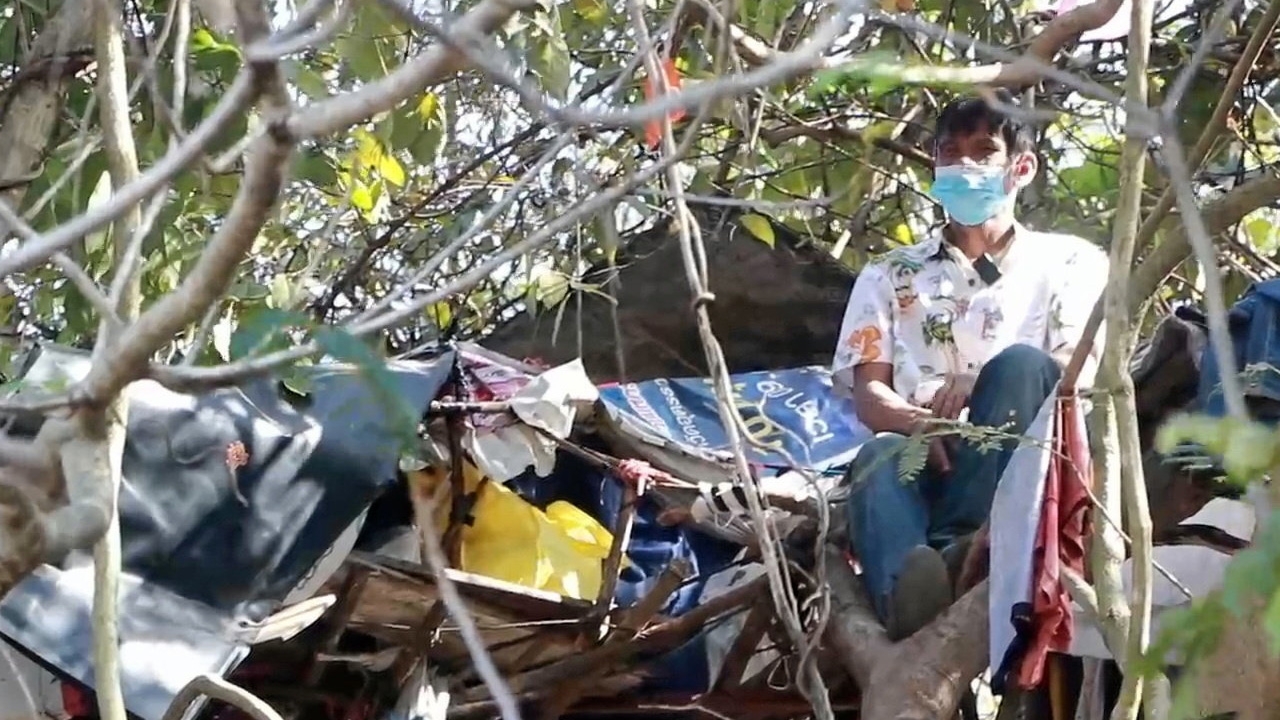 นายชาลี เศษแสงสี ฉายาทาร์ซานแห่งเมืองอุดรฯ หนุ่มช่างแอร์โดนพิษโควิดทำตกงาน ต้องย้ายออกจากห้องเช่าไปสร้างห้างทำเป็นที่พักอาศัยอยู่บนต้นไม้มานานกว่า 3 ปี ในป่าหลังชุมชนแวร์ซาย เขตเทศบาลนครอุดรธานี.