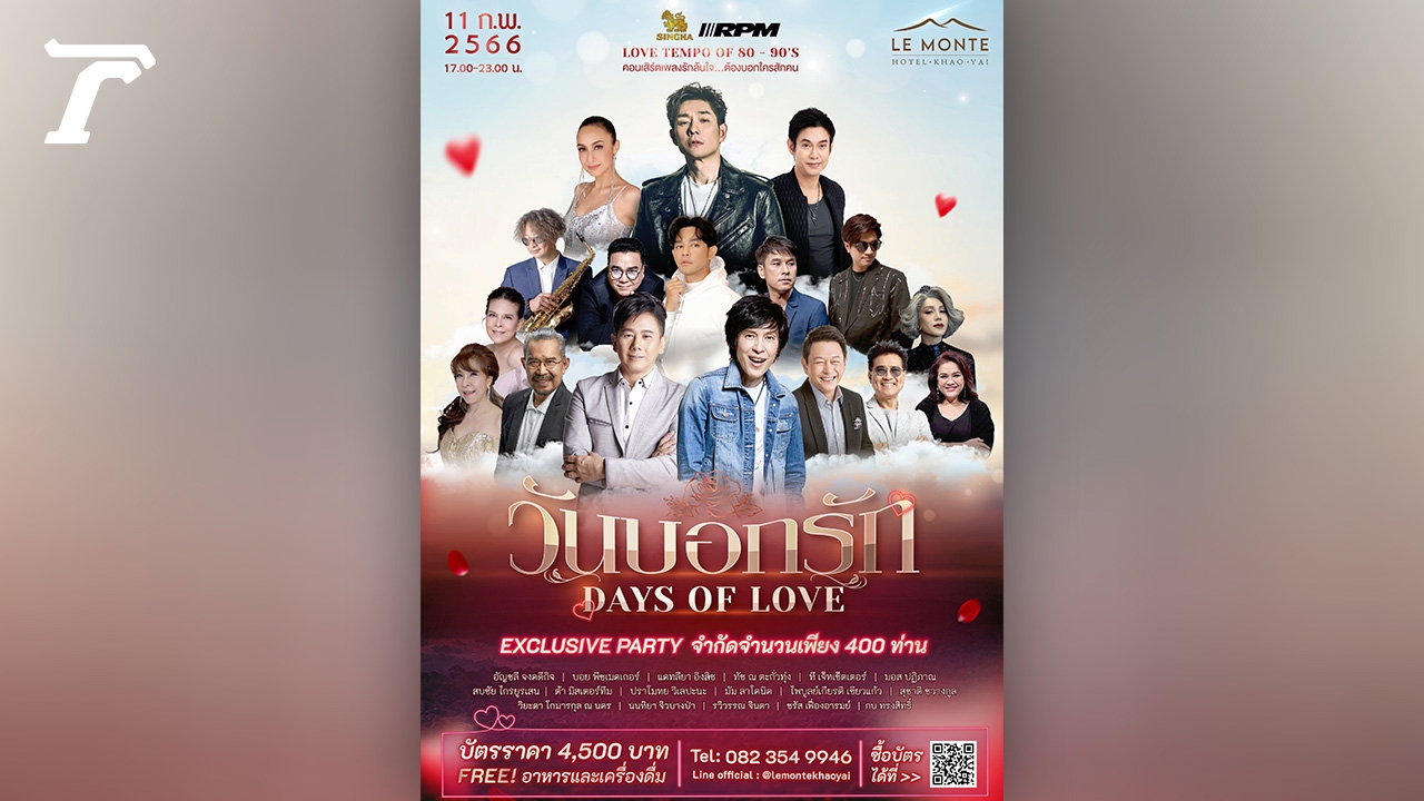 “บริษัท อาร์พีเอ็ม มีเดีย จำกัด” โดย “เป๊ก-สัณณ์ชัย เองตระกูล” ชวนบอกลาทุกความเหงาแล้วเดินทางมารับความรักจากเราแบบเต็มหัวใจ กับ 17 ศิลปินที่คุณจะประทับใจในคอนเสิร์ต “วันบอกรัก” (Days Of Love : Love Tempo of 80-90’S)คอนเสิร์ตเพลงรักล้นใจต้องบอกใครสักคน ต้อนรับเทศกาลแห่งความรักปีนี้ในบรรยากาศปาร์ตี้กับเพื่อนรู้ใจแบบสุดชิลท่ามกลางลมหนาวแห่งเขาใหญ่ เติมเต็มความสุขด้วยบทเพลงที่คุ้นเคยกับศิลปินที่คุณชื่นชอบ อาทิ อัญชลี จงคดีกิจ, บอย พีซเมคเกอร์, แคทลียา อิงลิช, ทัช ณ ตะกั่วทุ่ง, ที เจ็ทเซ็ตเตอร์, มอส-ปฏิภาณ, สบชัย ไกรยูรเสน, ต้า มิสเตอร์ทีม, ปราโมทย์ วิเลปะนะ, มัม ลาโคนิค, ไพบูลย์เกียรติ เขียวแก้ว, สุชาติ ชวางกูร, วิยะดา โกมารกุล ณ นคร, นนทิยา จิวบางป่า, รวิวรรณ จินดา, ชรัส เฟื่องอารมย์, ทรงสิทธิ์ รุ่งนพคุณศรี รวมตัวกันจัดเต็มความสุขตลอดการแสดงกว่า 6 ชั่วโมงเต็ม ในวันเสาร์ที่ 11 ก.พ.66 ตั้งแต่ห้าโมงเย็นถึงห้าทุ่ม ณ โรงแรมเลอมอนเต้ เขาใหญ่ จ. นครราชสีมา จองบัตรได้แล้วที่ https://shop.line.me/@ lemontekhaoyai บัตรราคา 4,500 บาท (จำกัดจำนวนผู้เข้าชมเพียง 400 ท่าน) รวมอาหารและเครื่องดื่มจัดเต็มตลอดงาน ติดตามที่ โทร. 08-2354-9946 Facebook Fanpage : Le Monte Hotel KhaoYai.