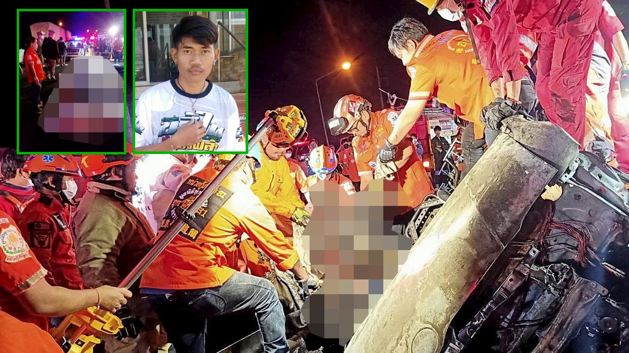 กู้ภัยทยอยนำร่างผู้เสียชีวิตออกจากซากรถตู้ ที่เสียหลักชนราวเหล็กร่องกลางถนนมิตรภาพ กม. ที่ 100 อ.สีคิ้ว จ.นครราชสีมา เกิดไฟลุกท่วมย่างสด 11 ศพ (ซ้าย) ส่วนนายธนชิต กิ่งแก้ว (ขวา) หนุ่มดวงแข็ง รอดตายคนเดียว ถีบกระจก ประตูแตกมุดตัวหนีออกจากรถมาได้หวุดหวิด.