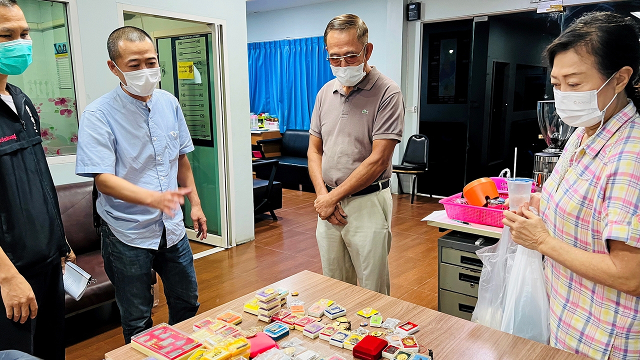 พล.อ.ท.อุทัย เศรษฐวงศ์ อายุ 68 ปี อดีตนายทหารอากาศ ตรวจดูของกลางพระเครื่องและของมีค่าอื่นๆ หลังถูกแก๊งตีนแมวผัวเมียลูกและน้องชายร่วมกันโจรกรรมจากบ้านใน อ.ไทรน้อย จ.นนทบุรี ถูกตำรวจตามรวบยกครัว.