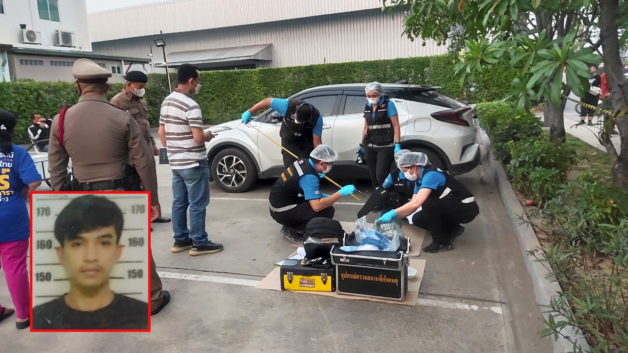 เจ้าหน้าที่เก็บหลักฐาน ในรถยนต์โตโยต้า ซี-เอชอาร์ สีขาว ทะเบียนป้ายแดง ร 2138 กรุงเทพมหานคร ที่นายวรายุ แก้วสง่า (ภาพเล็ก) ขับมาจอดบริเวณลานจอดรถหมู่บ้านเดอะมิราเคิล พลัส เพชรเกษม 63 โครงการ 2 แล้วจุดเตาอั้งโล่รมควันเสียชีวิต สันนิษฐานจากปัญหาถูกลูกค้าธุรกิจขายอะไหล่คอมพิวเตอร์ของตัวเองฟ้องร้องที่ จ.นครนายก.