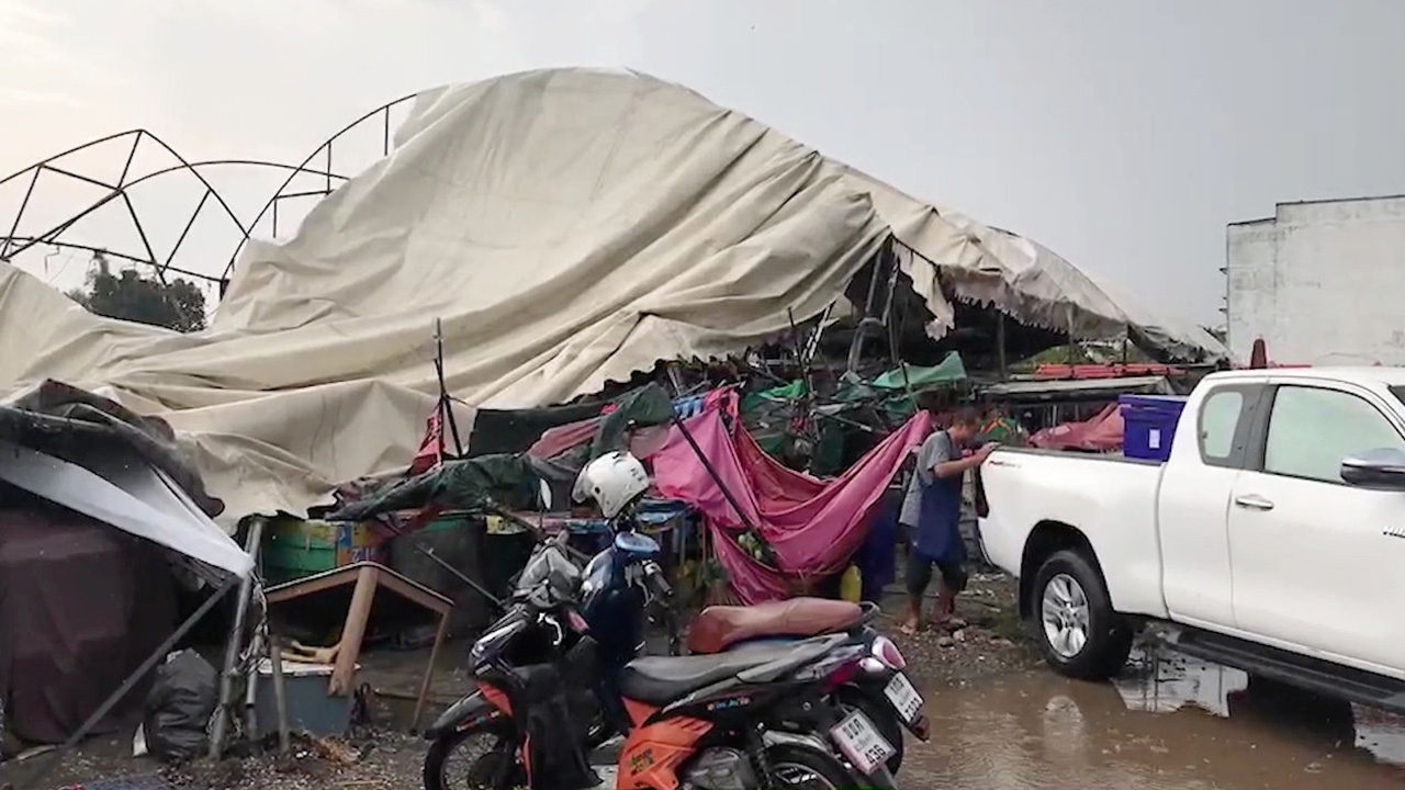 สภาพเต็นท์ขายของขนาดใหญ่ภายในตลาดนัดคลองเจ้า ริมถนนสุวินทวงศ์ ต.คลองอุดมชลจร อ.เมืองฉะเชิงเทรา ถูกพายุพัดถล่มอย่างรุนแรงนานกว่า 1 ชม. จนพังถล่มลงมา บรรดาพ่อค้าแม่ค้าต่างวิ่งหนีตายอลหม่าน.