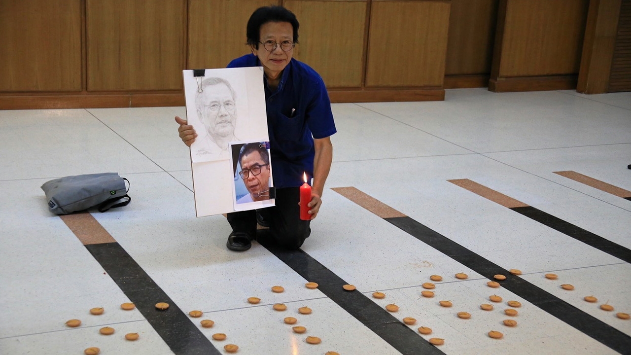 นพ.ทศพร เสรีรักษ์ ผู้สมัคร ส.ส.แพร่ พรรคเพื่อไทย แสดงเชิงสัญลักษณ์ เป็นการไว้อาลัยต่อการทำงานของ กกต. หลังเข้ายื่นหนังสือเรียกร้องให้ยกเลิกการจัดเลือกตั้งล่วงหน้า และให้ กกต.ทั้งหมดแสดงความรับผิดชอบลาออก.