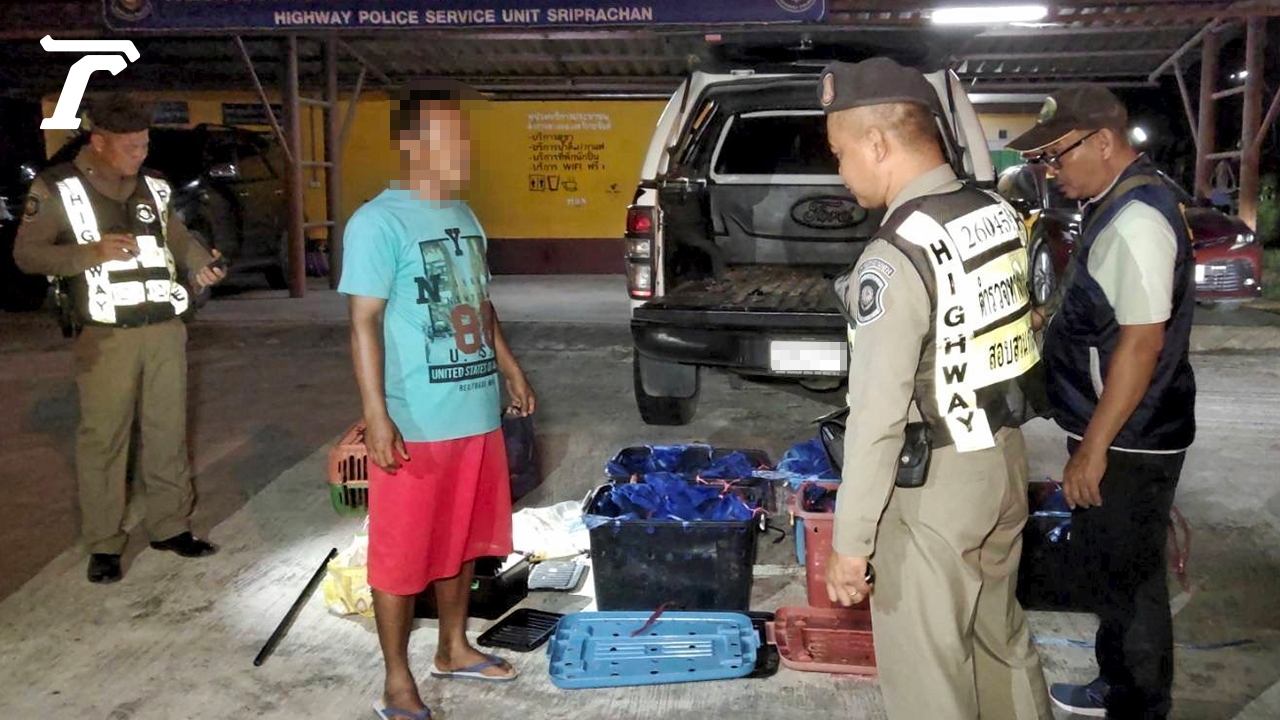 ตำรวจสนธิกำลังรวบผัวเมียค้าลิงแสม ขณะลำเลียงจาก จ.ราชบุรี ส่งชายแดน จ.สระแก้ว เจ้าหน้าที่สกัดจับกลางทางพบลิงแสมถูกยิงด้วยยาสลบจับยัดถุงรวม 33 ตัว ตายไป 1 ตัว สารภาพล่าลิงแสมที่ป่าใน จ.ราชบุรี ส่งขายนายทุน ตัวใหญ่ 2,000 บาท ตัวเล็ก 200-1,000 บาท คาดส่งลิงขายข้ามแดนนำไปทำยาโด๊ป ขณะที่สัตวแพทย์เร่งเยียวยาลิงแสมมีสภาพอ่อนแรงน่าเป็นห่วงรวบผัวเมียค้าลิงแสมรายนี้ เปิดเผยเมื่อเวลา 23.00 น. วันที่ 17 มิ.ย. พ.ต.ท.คำนวณ จันทร์อนันต์ รอง ผกก.5 บก.ปราบปรามการกระทำความผิดเกี่ยวกับธรรมชาติและสิ่งแวดล้อม (บก.ปทส.) พ.ต.ท.อิทธิศักดิ์ ค้ำคูณ สว.ทางหลวงกาญจนบุรี และ ด.ต.สุทัศน์ ทองไทย หัวหน้าหน่วยบริการประชาชนตำรวจทางหลวงศรีประจันต์ จ.สุพรรณบุรี ร่วมกันจับกุมนายชุมแพร เที่ยงอยู่ อายุ 42 ปี อยู่บ้านเลขที่ 145 หมู่ 9 ต.เนินบ่อ อ.สามง่าม จ.พิจิตร และนางเกิน เชา อายุ 38 ปี ภรรยาชาวกัมพูชา พร้อม ของกลางลิงแสม 33 ตัว ซากลิงแสม 1 ตัว และรถกระบะฟอร์ด เรนเจอร์ สีขาว ทะเบียน บพ 5356 พิจิตร ทะเบียนปลอม 2 แผ่น และลูกดอกยาสลบ 100 ดอก รวบตัวที่ถนนสาย 340 หลัก กม.ที่ 95-96 ต.วังน้ำซับ อ.ศรีประจันต์ จ.สุพรรณบุรีคดีนี้สืบเนื่องจาก พ.ต.ท.คำนวณ จันทร์อนันต์ รอง ผกก.5 บก.ปทส. สืบทราบว่า มีแก๊งล่าสัตว์ป่า คุ้มครองประเภทลิงแสมส่งขายให้นายทุนขายข้ามแดน กระทั่งรู้ตัวผู้กระทำผิดขับรถกระบะฟอร์ด เรนเจอร์ สีขาว ทะเบียน บพ 5356 พิจิตร นำลิงแสมลำเลียง ผ่านมาทาง จ.ราชบุรี ผ่านไปยัง จ.สุพรรณบุรี มุ่งหน้า จ.สระแก้ว จากนั้นประสานตำรวจทางหลวงกาญจนบุรีและสุพรรณบุรีตรวจสอบเขตพื้นที่รับผิดชอบ พบรถกระบะคันดังกล่าวมีหลังคาแครี่บอยปิดฝาท้ายมิดชิดวิ่งอยู่บนถนนสาย 340 สุพรรณบุรี มุ่งหน้าไป จ.ชัยนาท เมื่อถึงหลักกิโลเมตรที่ 95-96 ต.วังน้ำซับ อ.ศรีประจันต์ จ.สุพรรณบุรี ตำรวจทางหลวงส่งสัญญาณเรียกรถยนต์คันดังกล่าวให้หยุด และแสดงตัว ขอตรวจค้นจับกุมตรวจสอบพบกล่องพลาสติกมีฝาปิดขนาดใหญ่ อยู่ภายในรถ พบในกล่องมีสัตว์ป่าคุ้มครองประเภทลิงแสมถูกขังอยู่ในถุงตาข่ายสีฟ้าบรรจุอยู่ภายในกล่องพลาสติกอย่างหนาแน่นจำนวน 5 ใบ รวมลิงแสม จำนวน 33 ตัว ซากลิงแสม 1 ซาก เจ้าหน้าที่ตำรวจ ยึดไว้เป็นของกลาง พร้อมประสาน สพ.ญ.ณฐนน ปานเพ็ชร นายสัตวแพทย์ชำนาญการ เขตห้ามล่าสัตว์ป่าบึงฉวากและศูนย์พัฒนาการจัดการสัตว์ป่าบึงฉวาก จ.สุพรรณบุรี เจ้าหน้าที่พิทักษ์ป่า สำนักงานสนับสนุนการป้องกันและปราบปรามและประปาที่ 1 (ภาคกลาง) และเจ้าหน้าที่ตำรวจ สภ.ศรีประจันต์ ร่วมตรวจสอบนายชุมแพร เที่ยงอยู่ ผู้ต้องหาสารภาพว่า มีอาชีพทำนา แต่เงินไม่พอใช้ ก่อนหน้านี้ไ