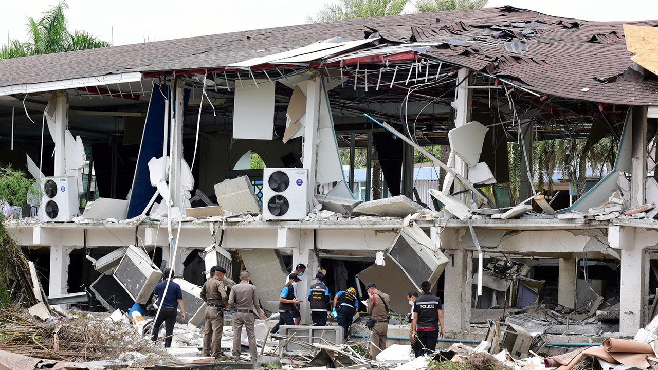 ตำรวจร่วมกับเจ้าหน้าที่พิสูจน์หลักฐานและโยธาธิการตรวจสอบอาคารประชุมสัมมนา ห้องจัดเลี้ยง โรงแรมเดอะคาแนล อ.เมืองราชบุรี หลังเกิดเหตุถังแก๊สในโรงครัวระเบิด ทำให้ผนังห้อง หลังคาพังถล่มลงมาเกือบทั้งหลัง เป็นเหตุให้แม่ครัวและพนักงานฝ่ายจัดเลี้ยงบาดเจ็บ 4 คน.
