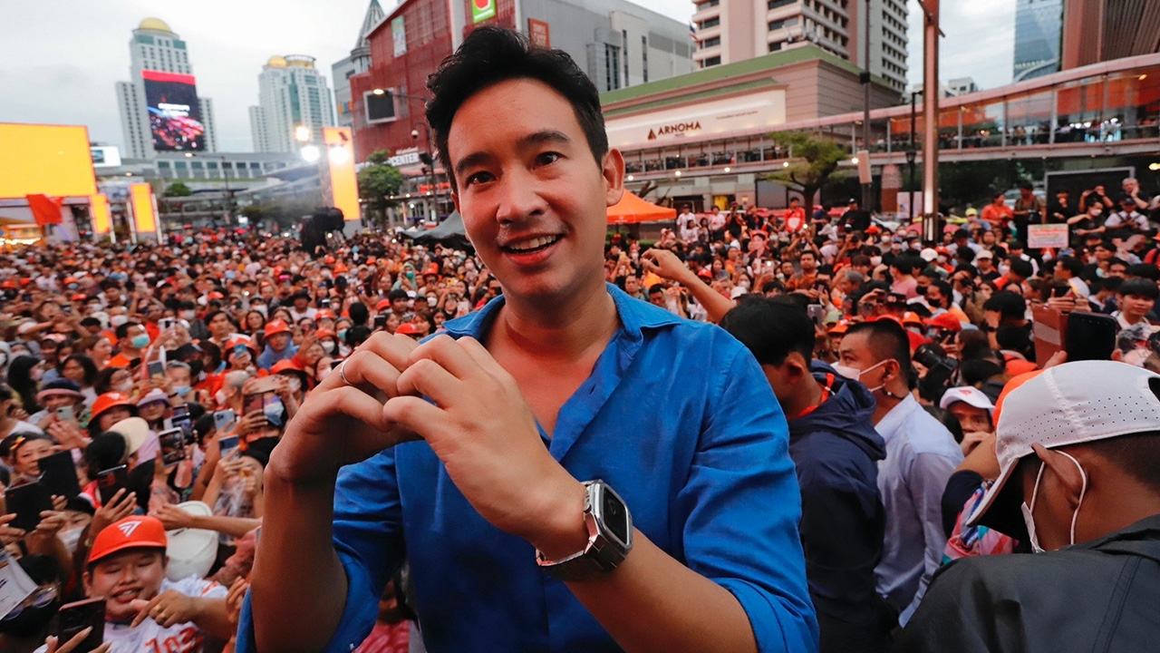 นายพิธา ลิ้มเจริญรัตน์ แคนดิเดตนายกฯ พรรคก้าวไกล ทำสัญลักษณ์มือเป็นรูปหัวใจส่งให้กับแฟนคลับ ท่ามกลาง “ด้อมส้ม” ที่มาให้กำลังใจจนล้นลานหน้าเซ็นทรัลเวิลด์ ในกิจกรรม “ขอบคุณประชาชนฟังเสียงทุกคนก่อนโหวตนายกฯ” พร้อมกับขอ ส.ส. ส.ว.โหวตเพื่ออนาคตประเทศ.