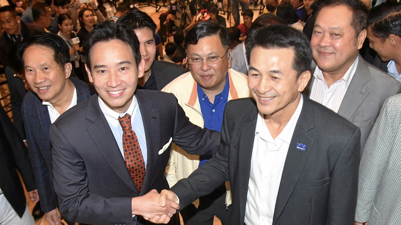 นายพิธา ลิ้มเจริญรัตน์ หัวหน้าและแคนดิเดตพรรคก้าวไกล จับมือกับ นพ.ชลน่าน ศรีแก้ว หัวหน้าพรรคเพื่อไทย เป็นมั่นเหมาะ หลังแกนนำ 8 พรรคร่วมจัดตั้งรัฐบาลมีมติเสนอชื่อนายพิธา โหวตเป็นนายกฯในที่ประชุมรัฐสภาอีกรอบหากไม่ได้คะแนนเพิ่มอย่างมีนัยสำคัญจะเปิดทางให้พรรคเพื่อไทยถือเอ็มโอยูเดิมเป็นแกนนำจัดตั้งรัฐบาลแทน.