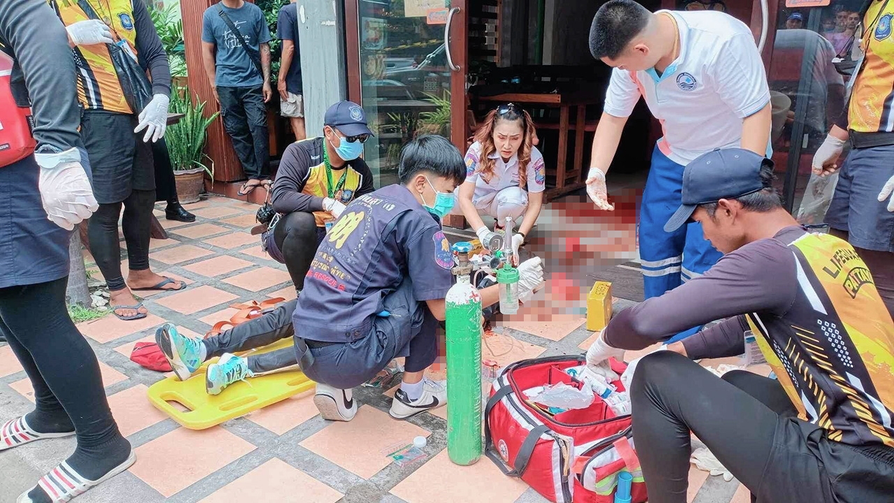 จนท.ปฐมพยาบาลนายสุนทร หรือเบน พอใจ อายุ 57 ปี อดีตกรรมการฟุตบอลไทยลีก ใช้มีดแทงตัวเองสาหัสหวังฆ่าตัวหนีผิด หลังหึงหวงเชือดคอฆ่านางเสาวจี หรือสาว เล็กเขียน อายุ 51 ปี เจ้าของเกสต์เฮาส์ย่านหาดจอมเทียน ต.หนองปรือ อ.บางละมุง จ.ชลบุรี.