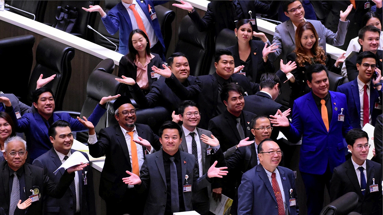 บรรดา สส.พรรคก้าวไกล พากันผายมือแสดงความประหลาดใจ เมื่อนายวันมูหะมัดนอร์ มะทา ประธานรัฐสภา สั่งปิดการประชุมรัฐสภาดื้อๆ หลังเกิดข้อโต้เถียงระหว่างนายรังสิมันต์ โรม สส.บัญชีรายชื่อ ผู้เสนอญัตติด่วนให้ทบทวนมติที่ประชุมรัฐสภา เมื่อวันที่ 19 ก.ค. กับกลุ่ม สว.