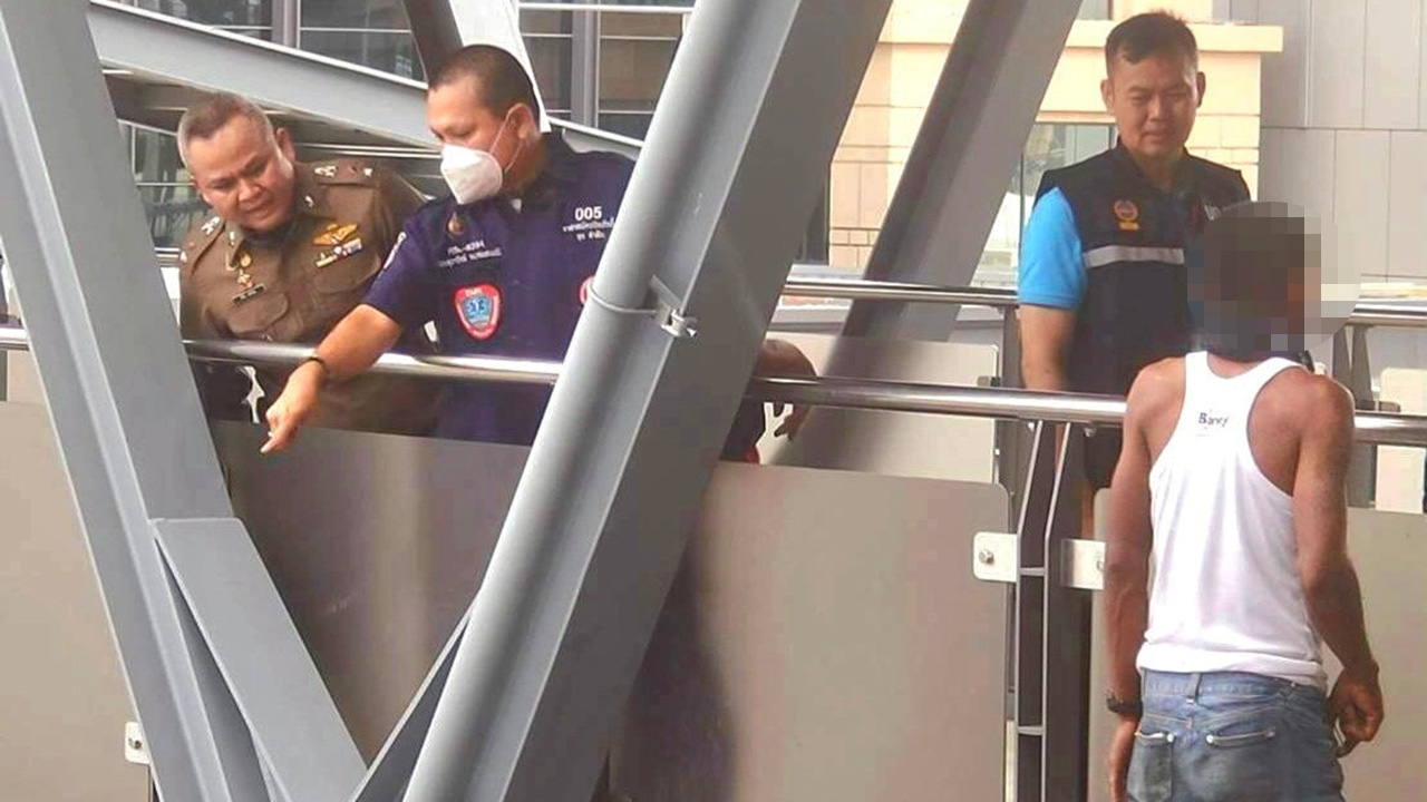 ตำรวจ สน.บางชัน เกลี้ยกล่อมนายสุทิน อุตะมะโยธิน หลังเมาเบียร์คลุ้มคลั่งจะกระโดดจากสะพานลอยสถานีรถไฟฟ้าสายสีชมพูหน้าห้างแฟชั่นไอส์แลนด์ จนเจ้าตัวเปลี่ยนใจ เหตุจากเมาเบียร์และทะเลาะกับเมีย.