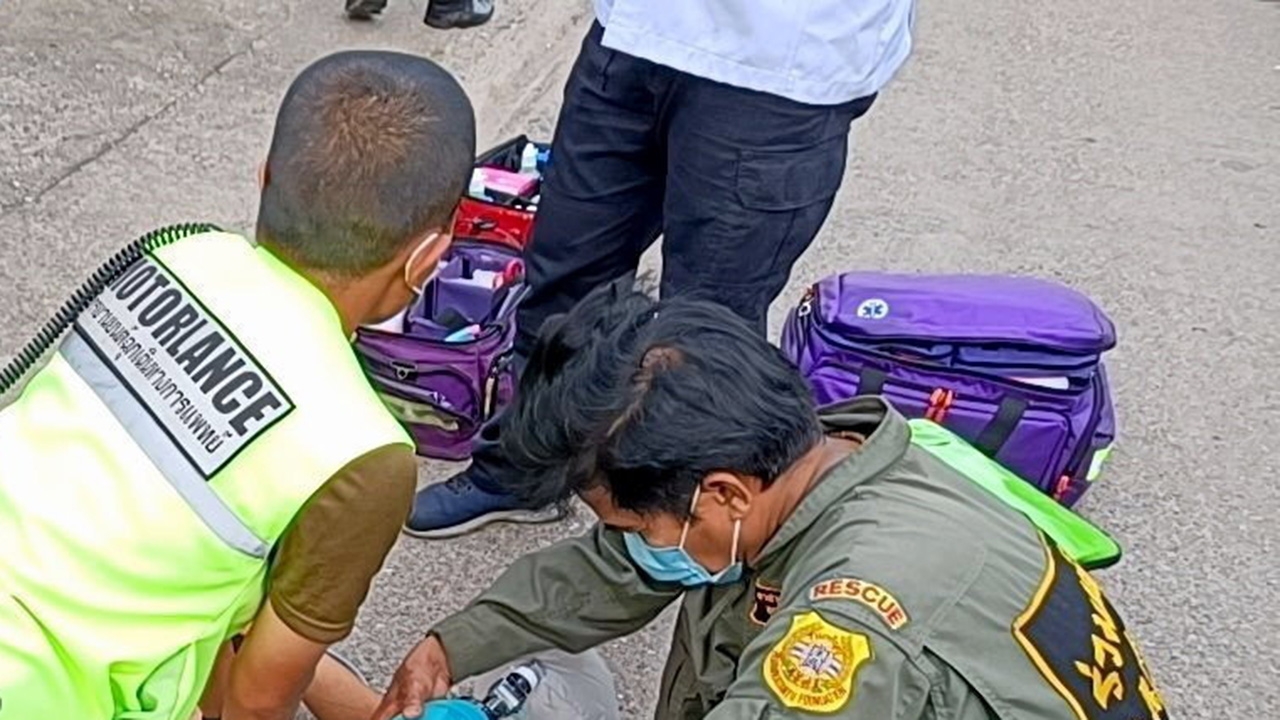เจ้าหน้าที่กู้ภัยปั๊มหัวใจช่วยชีวิตนายซอล เจอเรเมียห์ ทัมมาโก โรเซนทัล นศ.ม.รามคำแหง ลูกครึ่งฟิลิปปินส์-อเมริกัน แต่ยื้อชีวิตไม่ได้หลังถูกนายเซต เพื่อนลูกครึ่งไทย-ฟิลิปปินส์แทงเสียชีวิตเหตุทะเลาะกันในวงเหล้า.