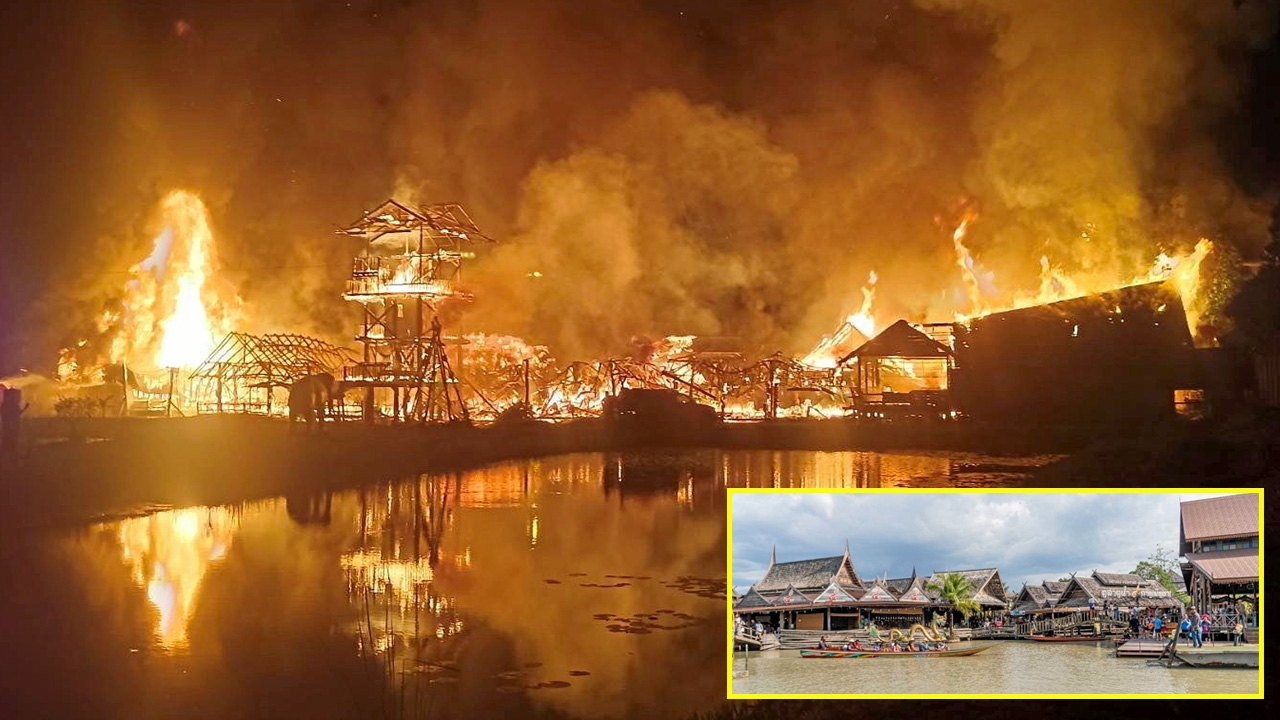 เจ้าหน้าที่กู้ภัย 555 บันทึกภาพเหตุการณ์เปลวเพลิงลุกโชนรุนแรงเผาอาคารร้านค้าในตลาดน้ำ 4 ภาค พัทยา ถนนสุขุมวิท เมืองพัทยา อ.บางละมุง เมื่อค่ำวันที่ 7 ก.ย. เผาผลาญสิ่งปลูกสร้างภายในตลาดเสียหายย่อยยับและขณะเพลิงไหม้มีเสียงระเบิดดังขึ้นเป็นระยะอย่างน่ากลัว.