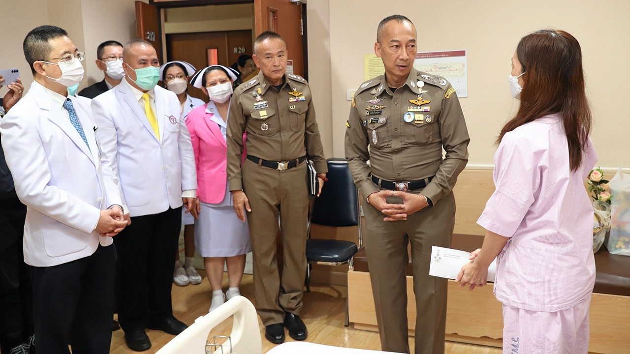 พล.ต.อ.ต่อศักดิ์ สุขวิมล ผบ.ตร. เยี่ยมผู้ได้รับบาดเจ็บจากเหตุการณ์กราดยิงที่ห้างสรรพสินค้าสยามพารากอน พักรักษาตัว ที่ชั้น 8 อาคารเฉลิมพระเกียรติรัชกาลที่ 9 โรงพยาบาลตำรวจ พร้อมมอบเงินและกระเช้าผลไม้เพื่อเป็นขวัญกำลังใจ.