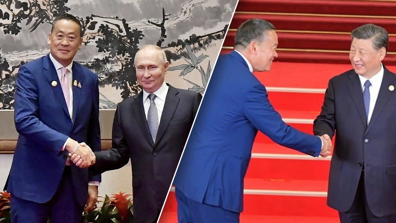 นายเศรษฐา ทวีสิน นายกฯ ยิ้มแย้มจับมือทักทายนายวลาดิเมียร์ ปูติน ประธานาธิบดีรัสเซีย ระหว่างการร่วมประชุมเวทีข้อริเริ่มสายแถบและเส้นทางครั้งที่ 3 ที่กรุงปักกิ่ง สาธารณรัฐ ประชาชนจีน ขณะที่นายสี จิ้นผิง ประธานาธิบดีจีน ต้อนรับนายกฯเข้าร่วมงานเลี้ยงรับรองอาหารค่ำ.