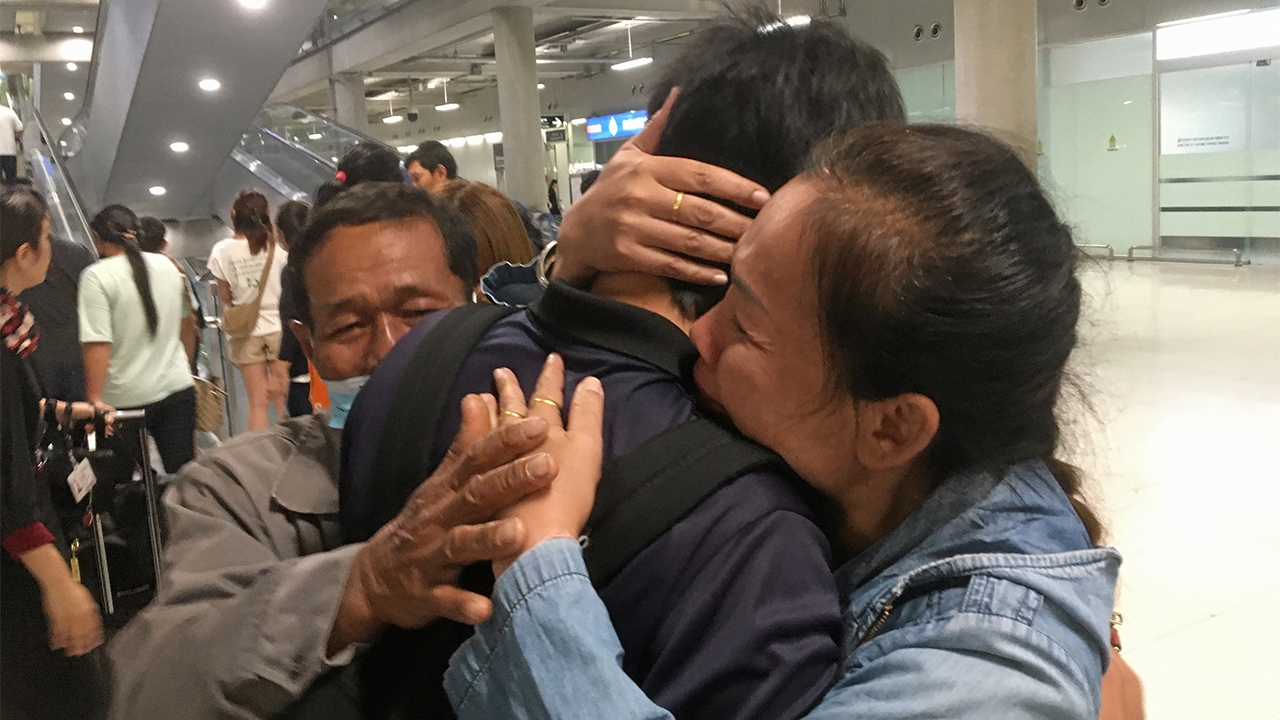 พ่อแม่ของแรงงานไทยรายหนึ่งในจำนวน 266 คน ที่เดินทางจากอิสราเอลเพื่อหนีสงครามกลับมาถึงท่าอากาศยานสุวรรณภูมิเมื่อช่วงเช้ามืดวันที่ 18 ต.ค. เข้ากอดรับขวัญลูกชายด้วยความดีใจที่ได้กลับมาพบหน้ากันอีกครั้ง.