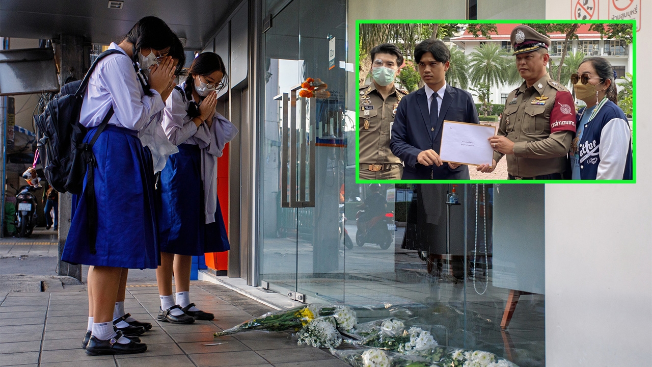นักเรียน ร.ร.พระหฤทัย คอนแวนต์วางช่อดอกไม้สีขาว หน้าธนาคารทหารไทย ธนชาตฯ สาขาคลองเตย เพื่อไว้อาลัย น.ส.ศิรดา หรือครูเจี๊ยบ สินประเสริฐ ขณะที่แม่และตัวแทนสโมสรนักศึกษาอุเทนถวายยื่นหนังสือขอความเป็นธรรมให้เหยื่อกระสุนที่เจ็บ ไม่ใช่ต้นเหตุครูถูกลูกหลง.อ่าน “คอลัมน์หนังสือพิมพ์ไทยรัฐ” ทั้งหมดที่นี่