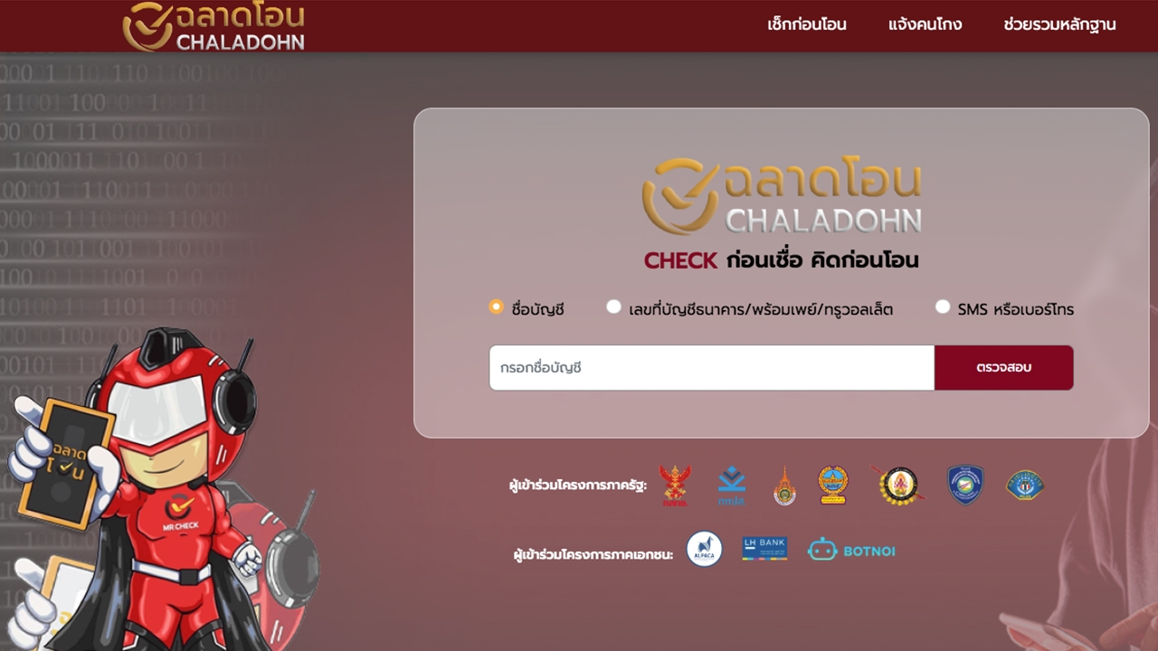 ปิดดำเนินการไปชั่วคราวเนื่องจากปัญหาทางเทคนิคพ.ต.อ.นิภพล สุขนิยม ผกก.สส.บก.น. 8 ที่อยู่เบื้องหลังคิดค้นร่วมกับ พ.ต.อ.ปราโมทย์ จันทร์บุญแก้ว ผกก.สน.เพชรเกษม ได้ร่วมกับอาสาสมัครภาคประชาชนตัดสินใจปลุกเว็บไซต์ฉลาดโอน “เช็กก่อนเชื่อ คิดก่อนโอน” ขึ้นมาอีกครั้งเพื่อเป็นช่องทางให้ประชาชนใช้ตรวจสอบข้อมูล “มิจฉาชีพ” ก่อนการโอนเงินมีการพัฒนาระบบและเทคโนโลยีให้ทันสมัย รองรับการเข้าใช้งาน รับแจ้งข้อมูลจากประชาชน และสามารถตรวจสอบข้อมูลในฐานข้อมูลผู้ถูกร้องเรียนได้อย่างถูกต้องแม่นยำมากขึ้นในครั้งนี้กลับมาพร้อมกับ มิสเตอร์เช็ก (Mr.Check) ฮีโร่ที่เป็นตัวแทนของอาสาสมัครภาคประชาชน ทำหน้าที่ช่วยเช็กข้อมูลด้านต่างๆได้อย่างรวดเร็วเปิดระบบตรวจสอบก่อนโอนตรวจสอบข้อมูล ชื่อบัญชีเลขบัญชี/เบอร์โทร./sms ของผู้รับโอน ข้อมูลทั้งหมด สามารถเชื่อถือได้ เพราะเป็นข้อมูลที่มาจากหน่วยงานภาครัฐ ภาคเอกชน และการแจ้งคนโกงจากประชาชนที่มีการยืนยันตัวตนแล้วระบบแจ้งคนโกง สามารถแจ้งข้อมูลคนโกงเพื่อป้องกันไม่ให้คนอื่นตกเป็นเหยื่อระบบช่วยรวมหลักฐานรับฟังจัดลำดับเหตุการณ์ สรุปเหตุการณ์ตั้งแต่ต้นเพื่อให้ง่ายต่อประชาชนและเจ้าหน้าที่ตำรวจในการแจ้งความดำเนินคดีขณะเดียวกันยังมีระบบยืนยันตัวตนผู้ขายสินค้าออนไลน์สามารถลงทะเบียนยืนยันตัวตน เพื่อสร้างตัวตนผู้ขายที่สุจริต สร้างความมั่นใจและความน่าเชื่อถือว่า “มีตัวตนจริง”สามารถติดต่อ Mr.Check ผ่านช่องทาง www.ฉลาดโอน.com facebook : ฉลาดโอน.com line id: @Chaladohnพวกเขาพุ่งเป้าลดเหยื่ออาชญากรรมออนไลน์ให้เหลือน้อยที่สุด.สหบาทคลิกอ่านคอลัมน์ "ส่องตำรวจ" เพิ่มเติม