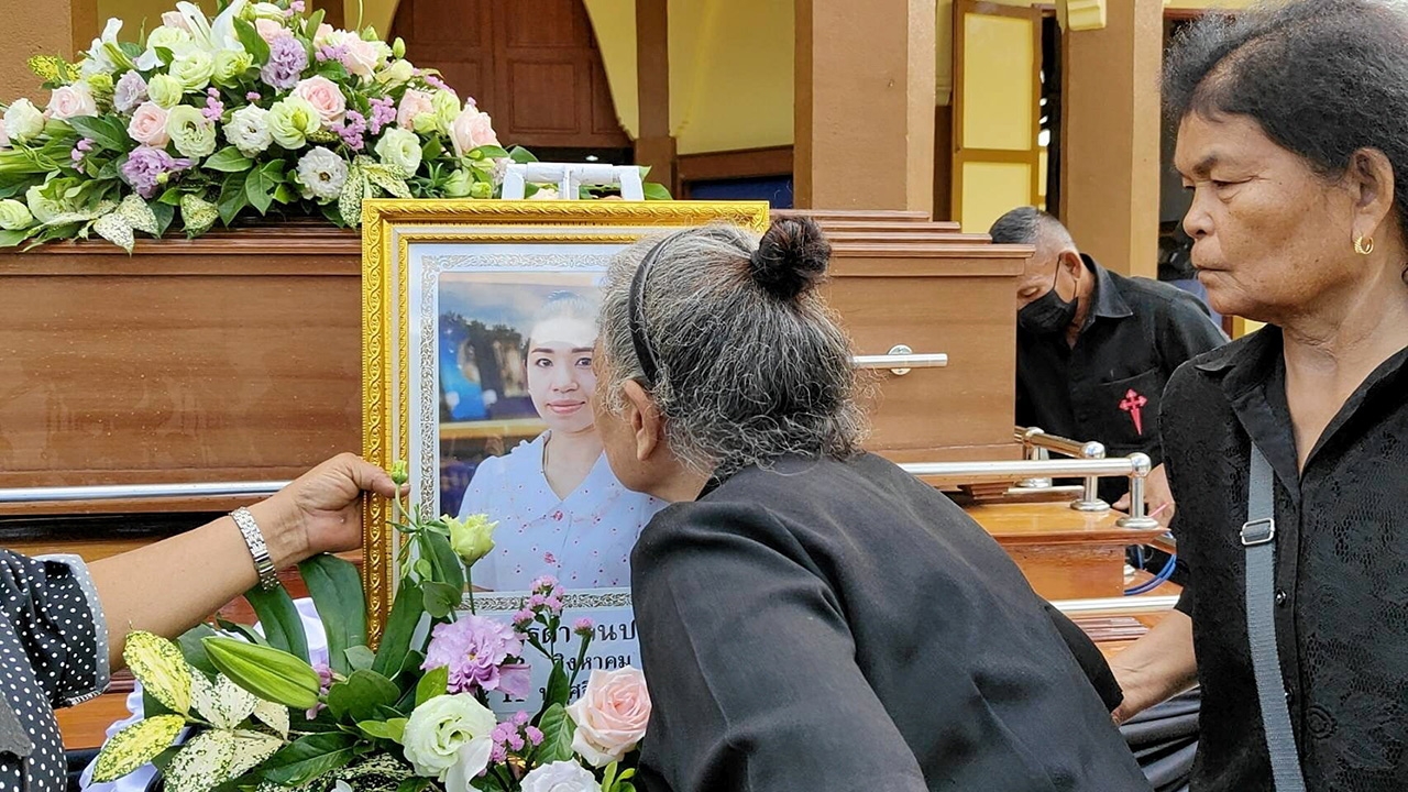 นางมณี สินประเสริฐ หอมภาพลูกสาว น.ส.ศิรดา หรือครูเจี๊ยบ สินประเสริฐ ระหว่างพิธีฝังศพตามศาสนาคริสต์ ที่สุสานวัดแม่พระประจักษ์ อ.สองพี่น้อง จ.สุพรรณบุรี ครูเจี๊ยบถูกลูกหลงเสียชีวิตจากเหตุการณ์ นศ.อุเทนถวาย ถูกคู่อริไล่ยิงหน้า ธ.ทหารไทยธนชาต สาขาคลองเตย.อ่าน “คอลัมน์หนังสือพิมพ์ไทยรัฐ” ทั้งหมดที่นี่