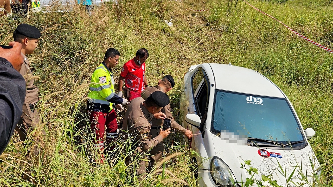 เจ้าหน้าที่ตรวจสอบรถเก๋งของนายสิงหวัฒน์ ดารา อายุ 49 ปี ผู้ช่วยนักข่าว BC New สื่อท้องถิ่นประจำ จ.พระนครศรีอยุธยา ถูกมือปืนควบรถ จยย.ไล่ตามประกบยิง 4 นัดซ้อนดับสยองคารถขณะพาสุนัขไปฉีดวัคซีน ก่อนเสียหลักลงข้างทางริมถนนในพื้นที่ ต.คานหาม อ.อุทัย จ.พระนครศรีอยุธยา ตำรวจมุ่ง 3 ปมโหด.